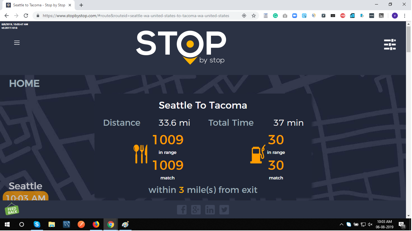 2. RoutePageRefesh. A. Navigate to test_server/ B. Type seat in the first textbox and pick Seattle from the dropdown. C. Type tac in the second textbox and pick Tacoma from the dropdown. D. Click View my trip. E. Route page should open showing exits with restaurants and gas station icons. F. Refresh the browser. Route page should open, NOT home page. Take screenshot. |