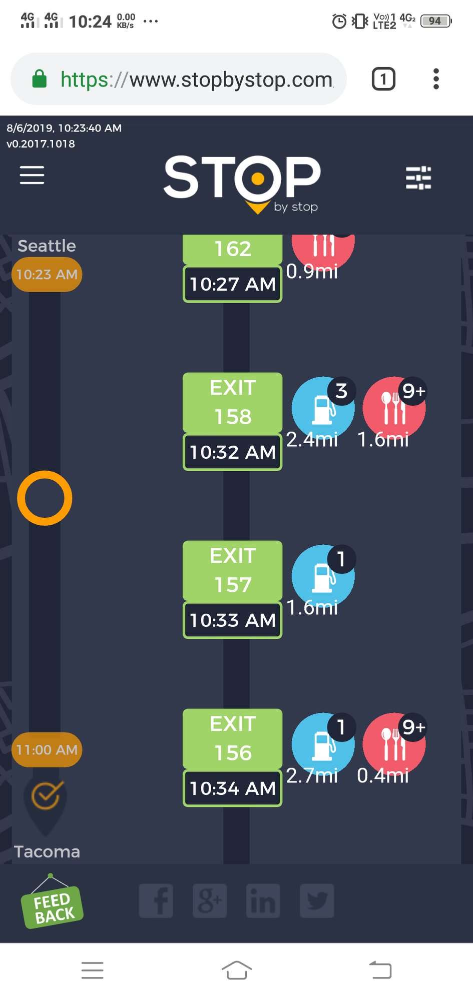 4. ExitPagesNavigation. A. Navigate to test_server/ B. Type Seattle to Tacoma route and navigate. C. Click on first exit. Verify that exit page opens and both - gas stations and restaurants are shown. Click back button in the browser to go back. D. Click on restaurant icon for the same exit and verify that same exit opens, but only restaurants are shown. Go back. E. Click on gas station icon for the same exit and verify that same exit opens, but only gas stations are shown. F. Verify that clicking on Phone icon opens Phone application. Some of the items (but not all of them) will have Yelp icon displayed next to them. Verify that clicking on Yelp icon navigates to Yelp website. Take a screenshot from Yelp website. |