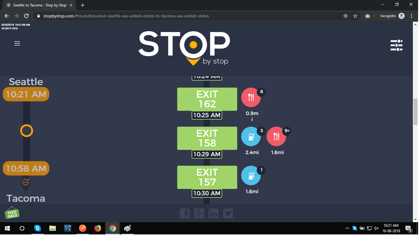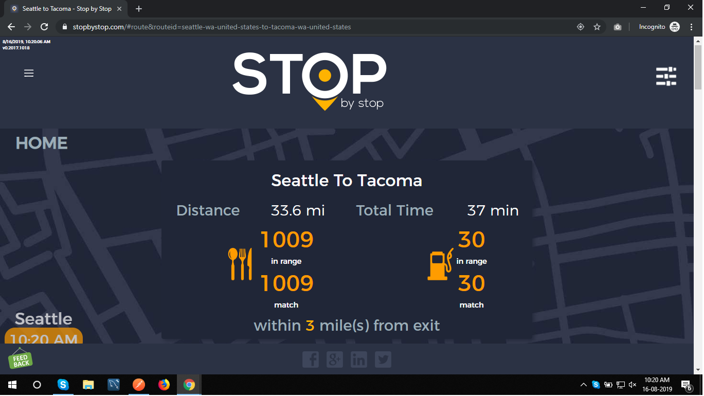 2. RoutePageRefesh. A. Navigate to test_server/ B. Type seat in the first textbox and pick Seattle from the dropdown. C. Type tac in the second textbox and pick Tacoma from the dropdown. D. Click View my trip. E. Route page should open showing exits with restaurants and gas station icons. F. Refresh the browser. Route page should open, NOT home page. Take screenshot. |