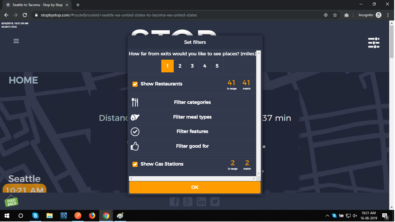 5. FiltersDistancePropagateToExit. A. Open Seattle to Tacoma route. B. Click on Filters and select 1 mile from exit. C. Close Filters popup and navigate to exit page. D. On the exit page open Filters popup and verify that distance settings (1 mile from exit) from route page are propagated. E. Take screenshot. |