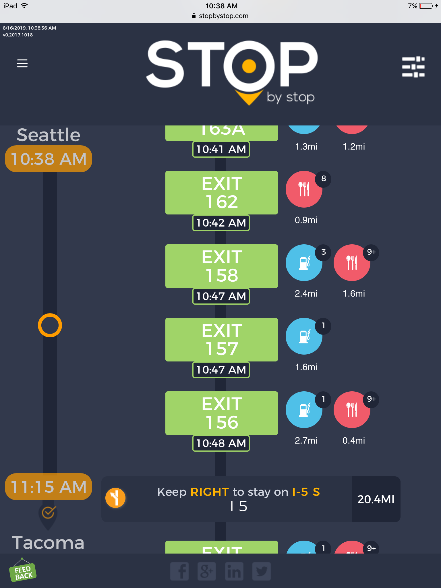 7. POISelectionMultipleWithMap. A. In the new browser tab open Seattle to Tacoma route. B. Click on first exit in the road line. Exit page should open. C. On the exit page click on the first item in the list. POI Page should open. D. Click on + button. POI selection popup should open. E. Click on Add to route. Route page should open. D. On the sidebar there should be an icon to indicate the place that was added to the route. E. Scroll the roadline all the way down and pick the last exit. Exit page should open. F. On the exit page select Map view. G. Verify that Map can be dragged around and zoomed in/out H. Click browser back button to go back to route page. I. On the sidebar there should be 1 place that you picked. Take a screenshot. |