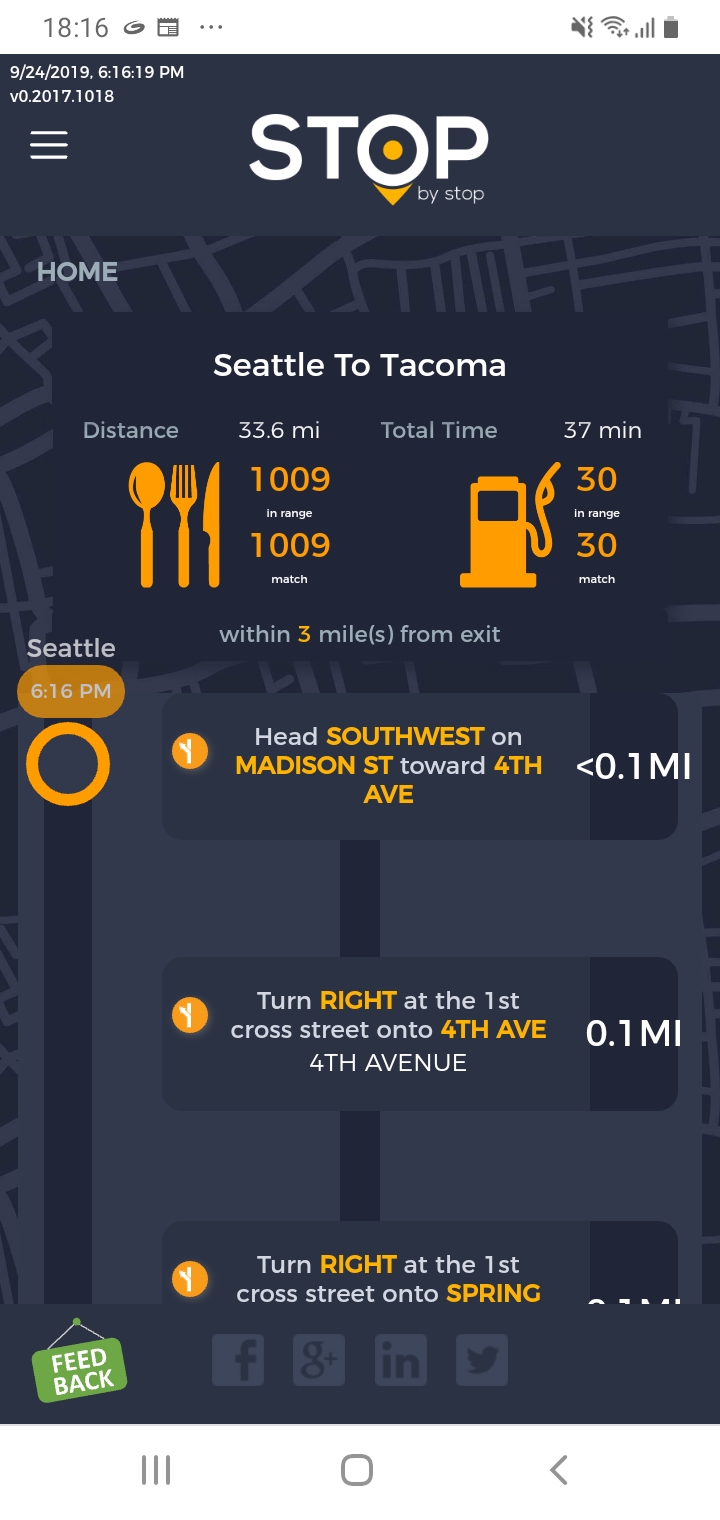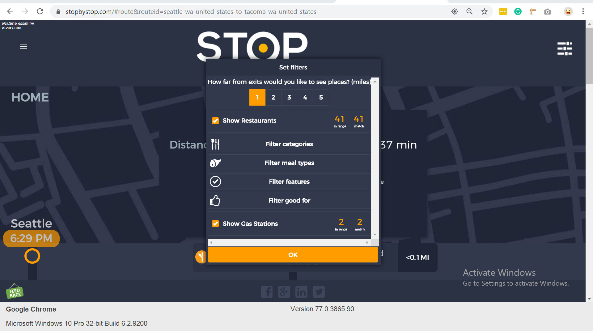 5. FiltersDistancePropagateToExit. A. Open Seattle to Tacoma route. B. Click on Filters and select 1 mile from exit. C. Close Filters popup and navigate to exit page. D. On the exit page open Filters popup and verify that distance settings (1 mile from exit) from route page are propagated. E. Take screenshot. |