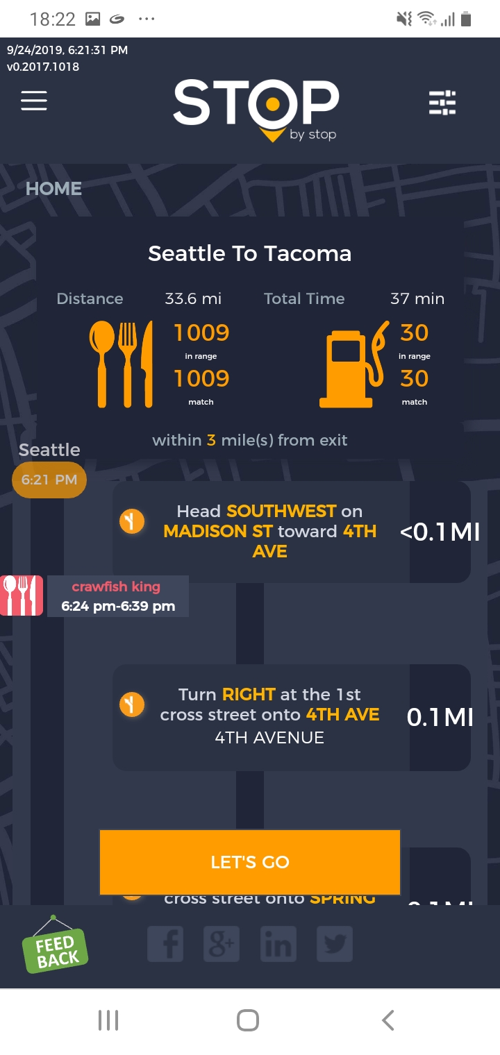 8. POISelectionGoToRoute. A. In the new browser tab open Seattle to Tacoma route. Click on first exit in the road line. Exit page should open. B. On the exit page click on the any item. POI page should open. </br/>C. On the POI page click Add to route button. POI selection popup should open. D. Click Add to route. Route page should open. E. On the sidebar there should be an icon to indicate the the place you picked. F. Click on Let's go button at the bottom of the screen. Google maps should open. Take a screenshot. |