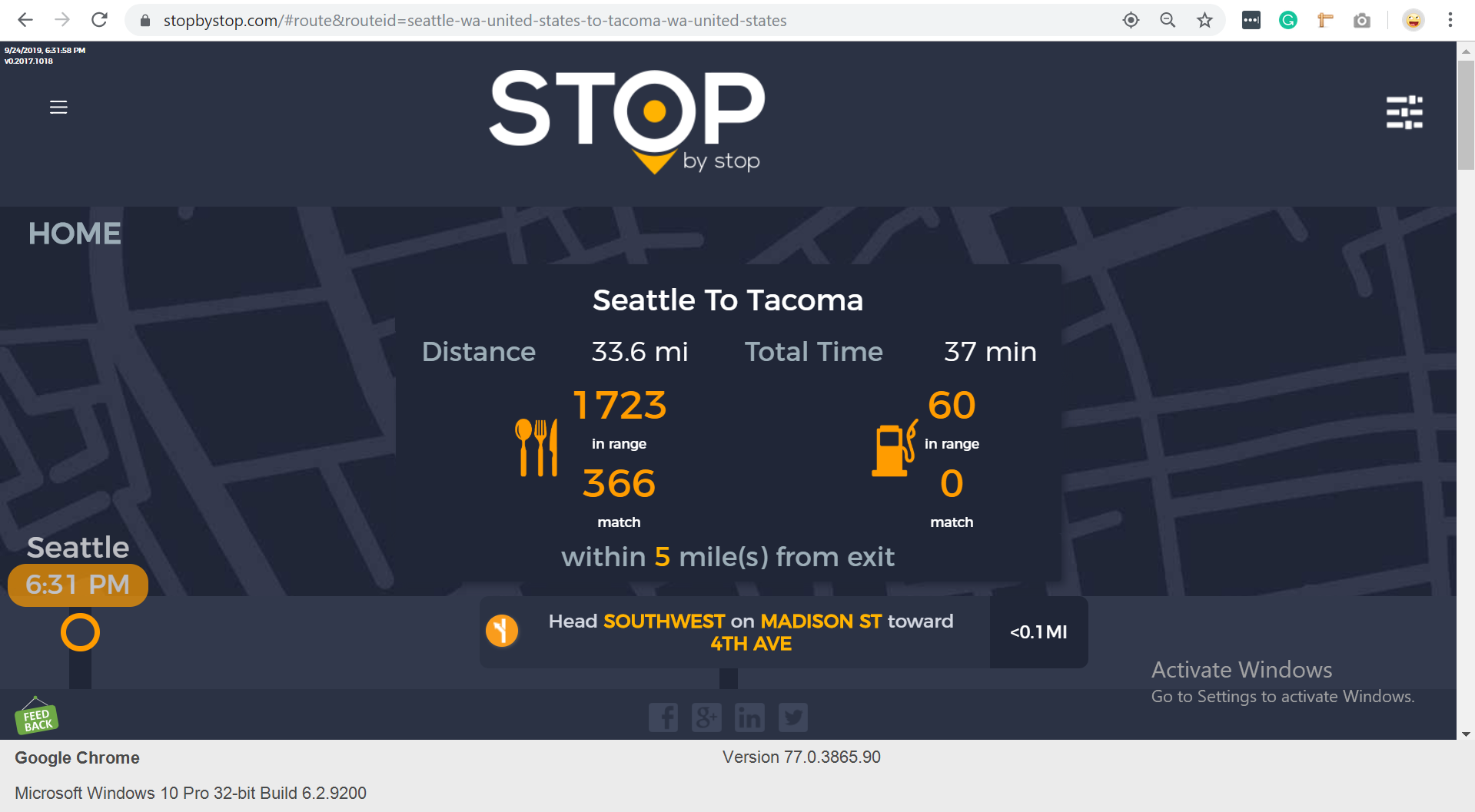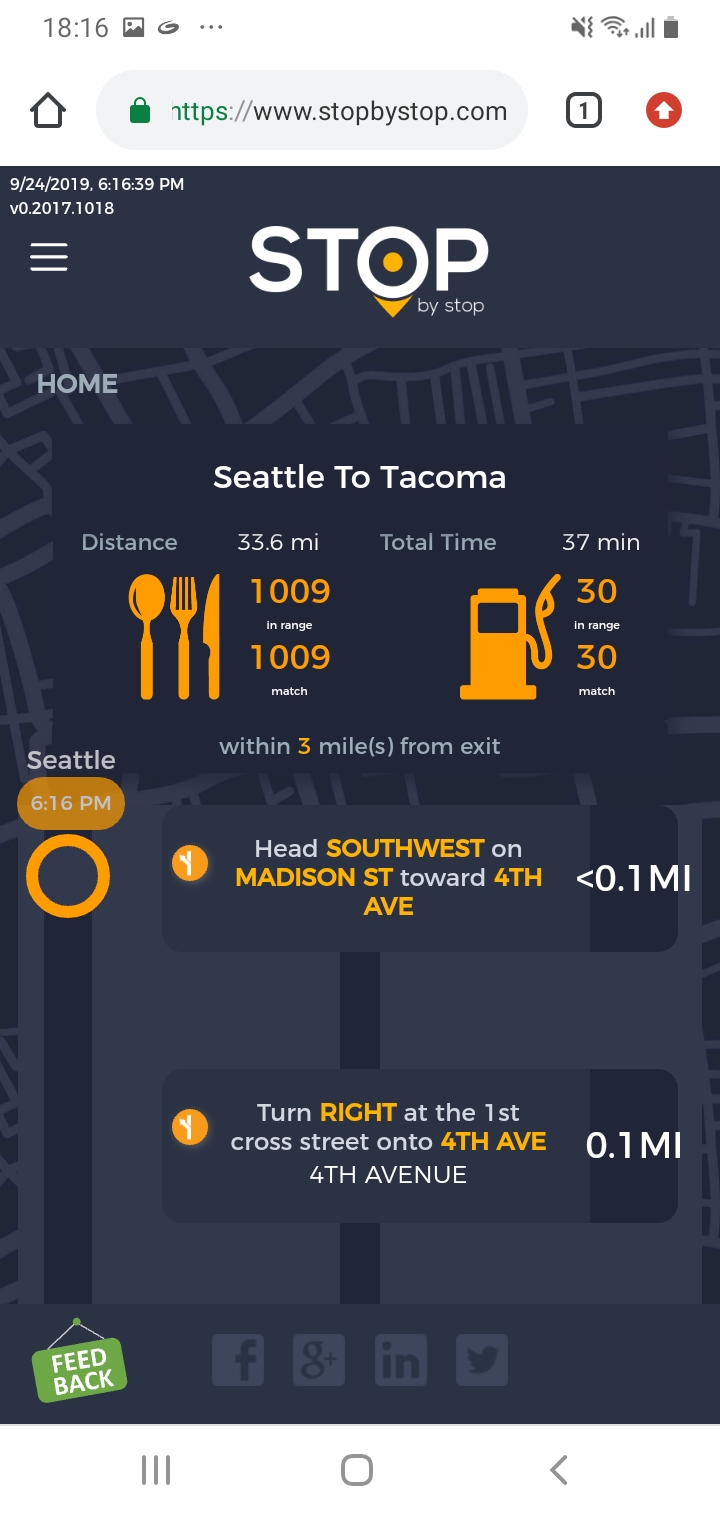 2. RoutePageRefesh. A. Navigate to test_server/ B. Type seat in the first textbox and pick Seattle from the dropdown. C. Type tac in the second textbox and pick Tacoma from the dropdown. D. Click View my trip. E. Route page should open showing exits with restaurants and gas station icons. F. Refresh the browser. Route page should open, NOT home page. Take screenshot. |