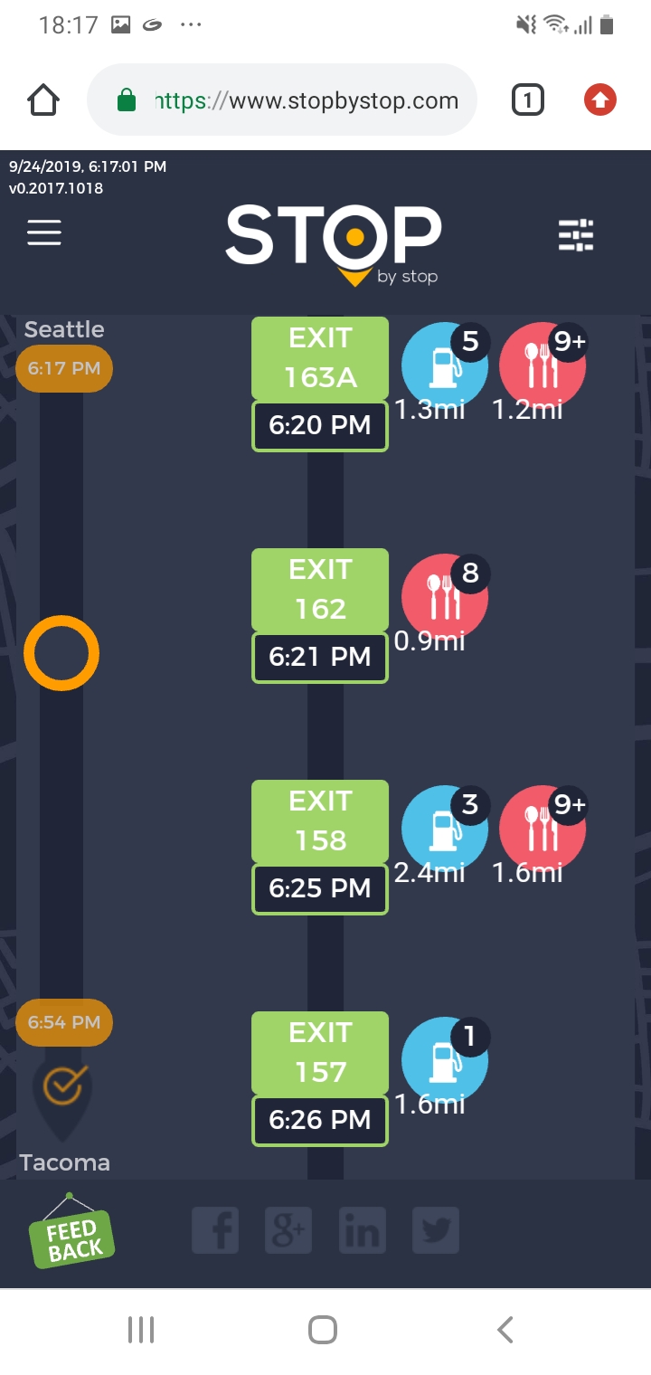 4. ExitPagesNavigation. A. Navigate to test_server/ B. Type Seattle to Tacoma route and navigate. C. Click on first exit. Verify that exit page opens and both - gas stations and restaurants are shown. Click back button in the browser to go back. D. Click on restaurant icon for the same exit and verify that same exit opens, but only restaurants are shown. Go back. E. Click on gas station icon for the same exit and verify that same exit opens, but only gas stations are shown. F. Verify that clicking on Phone icon opens Phone application. Some of the items (but not all of them) will have Yelp icon displayed next to them. Verify that clicking on Yelp icon navigates to Yelp website. Take a screenshot from Yelp website. |
