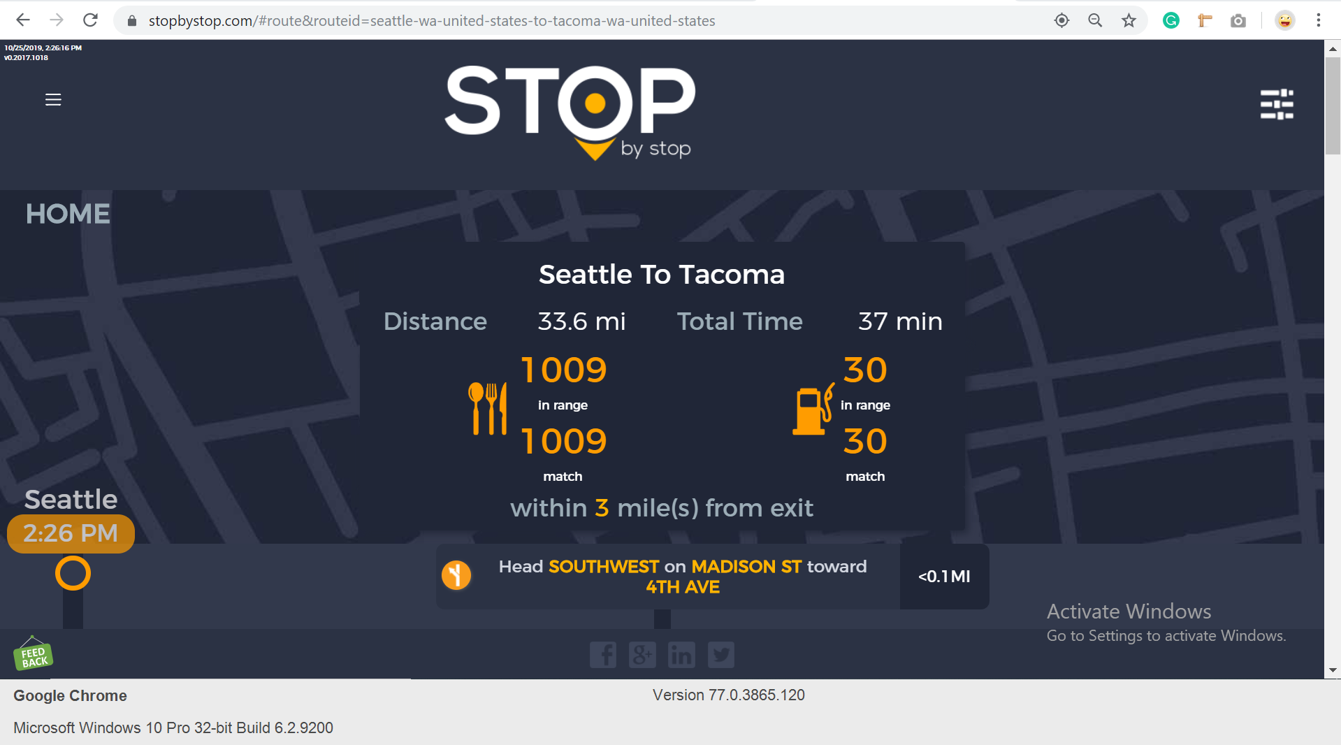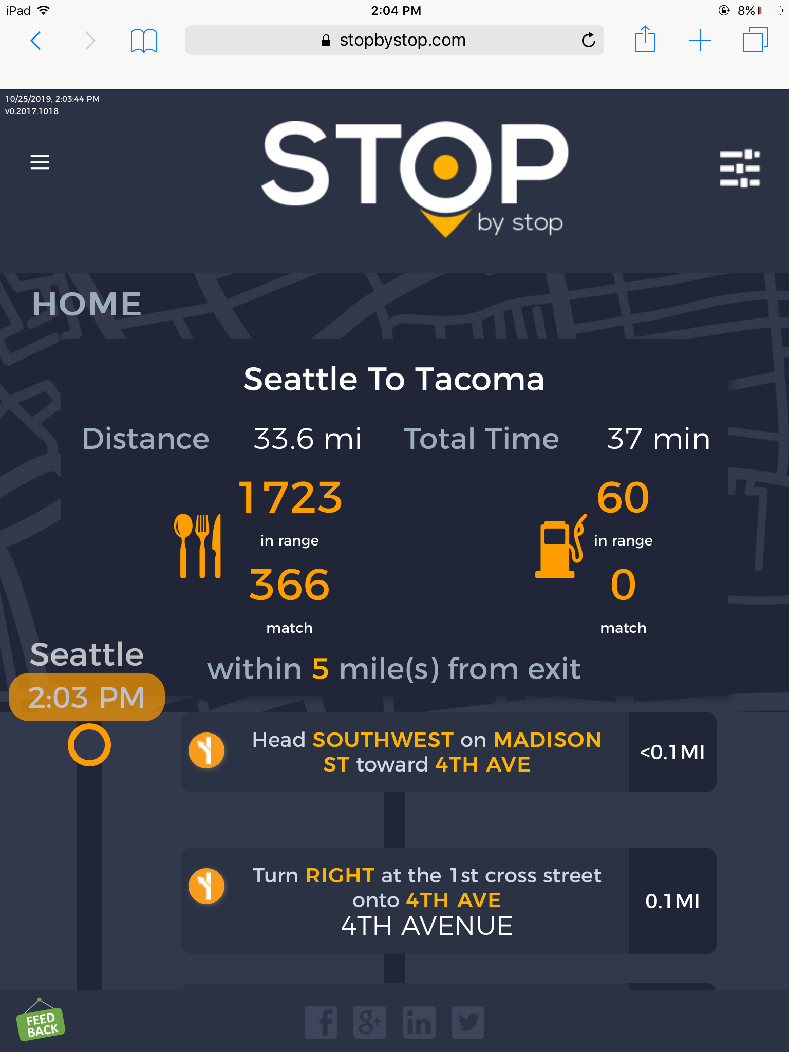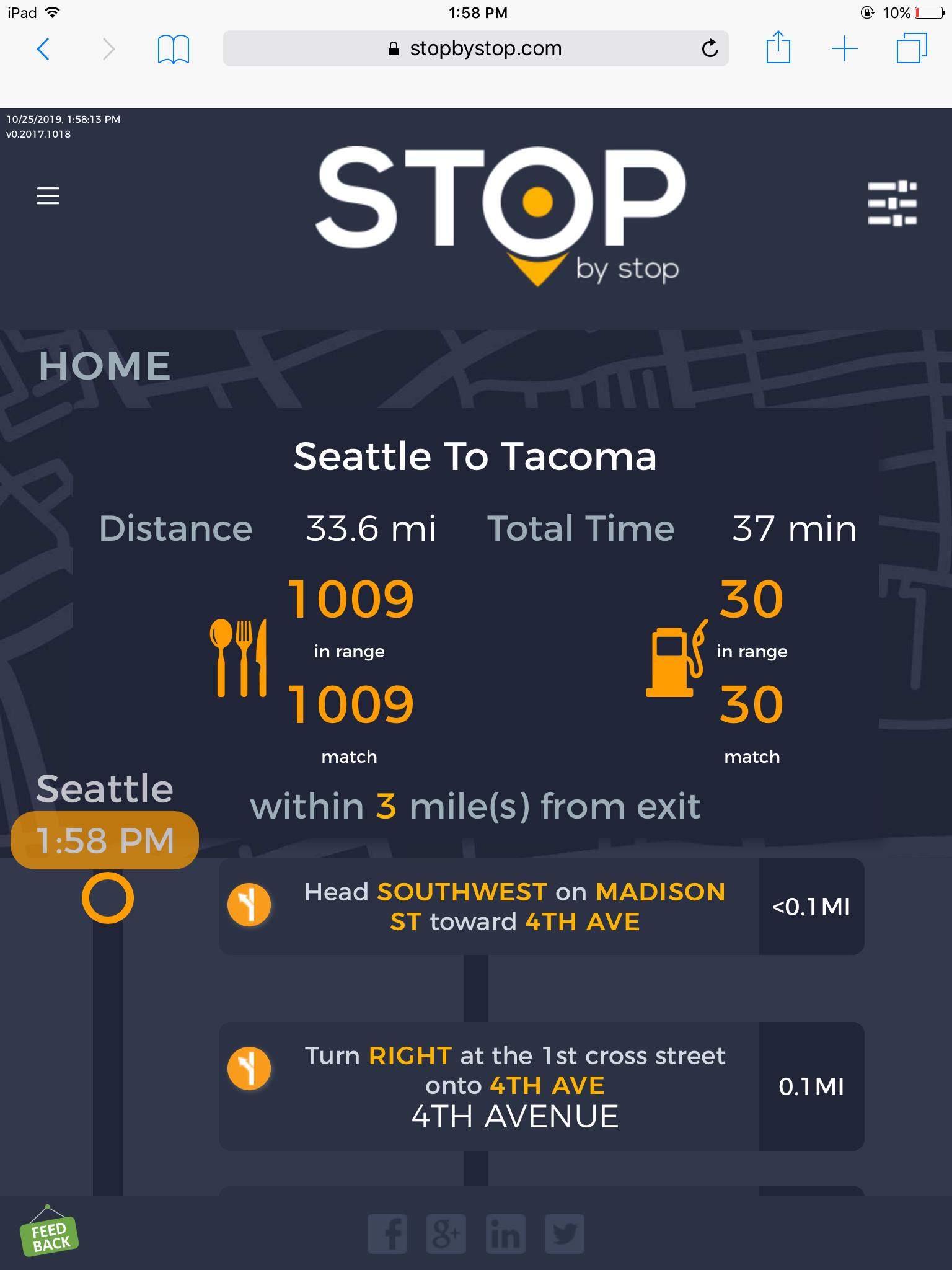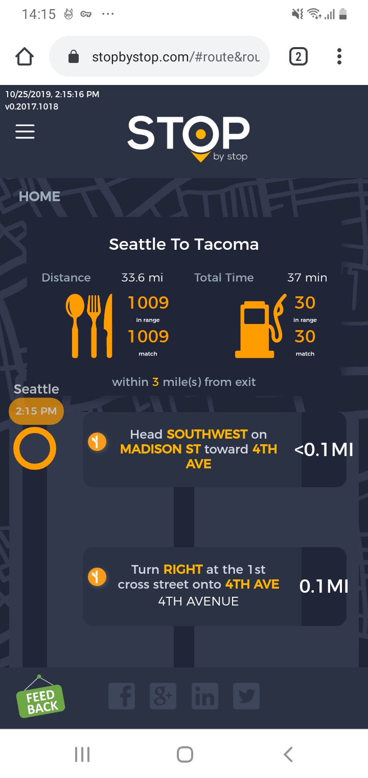 2. RoutePageRefesh. A. Navigate to test_server/ B. Type seat in the first textbox and pick Seattle from the dropdown. C. Type tac in the second textbox and pick Tacoma from the dropdown. D. Click View my trip. E. Route page should open showing exits with restaurants and gas station icons. F. Refresh the browser. Route page should open, NOT home page. Take screenshot. |