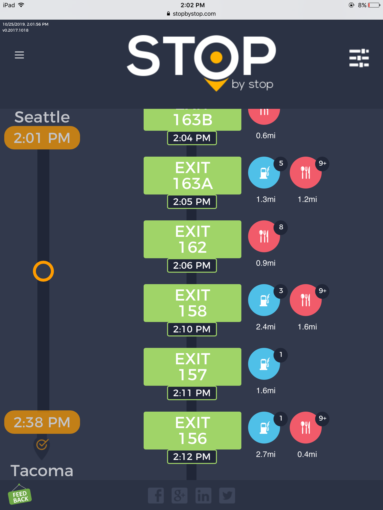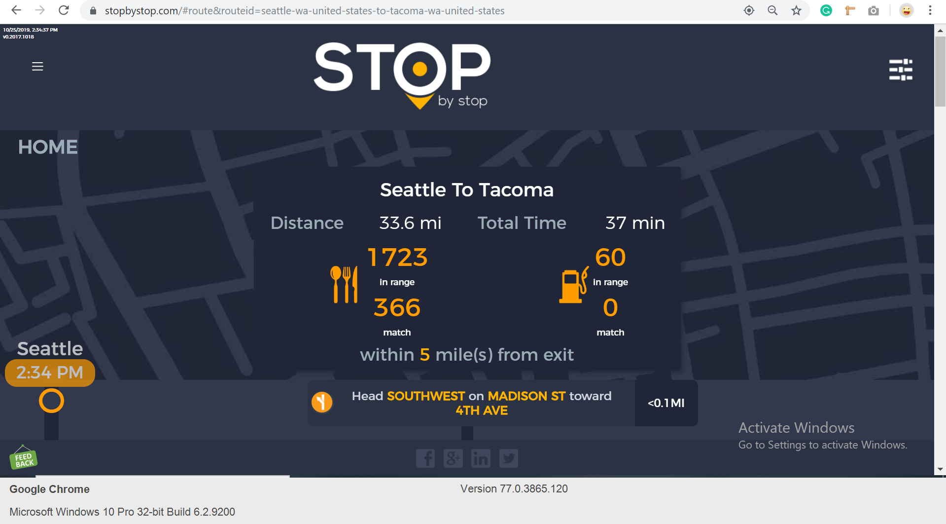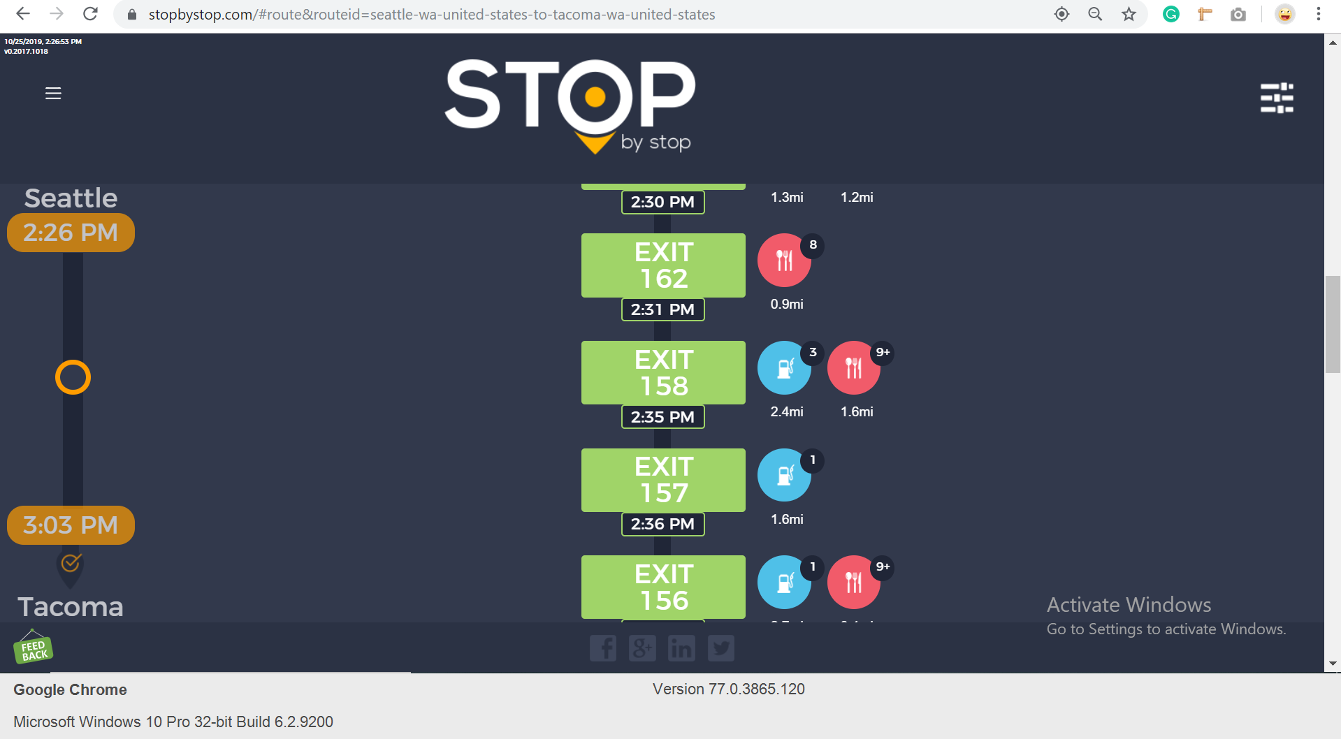 2. RoutePageRefesh. A. Navigate to test_server/ B. Type seat in the first textbox and pick Seattle from the dropdown. C. Type tac in the second textbox and pick Tacoma from the dropdown. D. Click View my trip. E. Route page should open showing exits with restaurants and gas station icons. F. Refresh the browser. Route page should open, NOT home page. Take screenshot. |