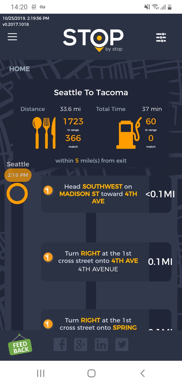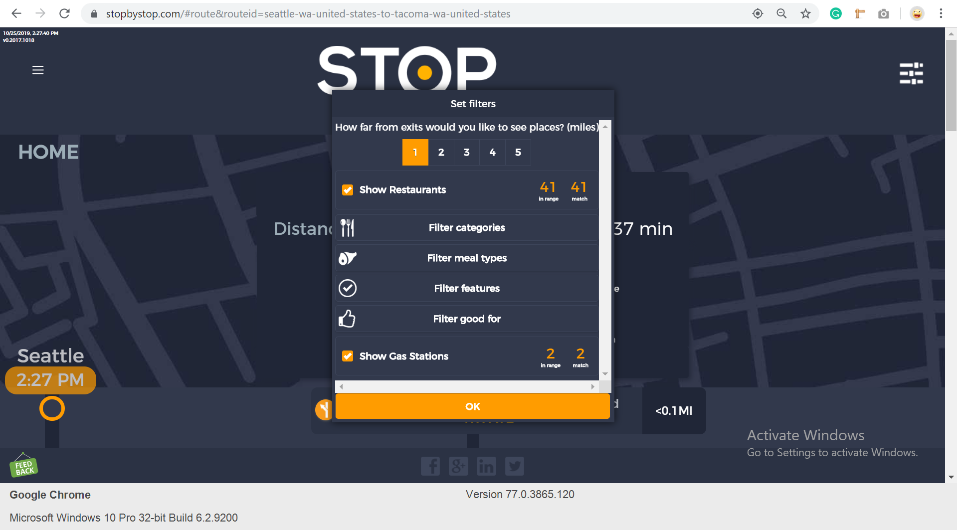 5. FiltersDistancePropagateToExit. A. Open Seattle to Tacoma route. B. Click on Filters and select 1 mile from exit. C. Close Filters popup and navigate to exit page. D. On the exit page open Filters popup and verify that distance settings (1 mile from exit) from route page are propagated. E. Take screenshot. |