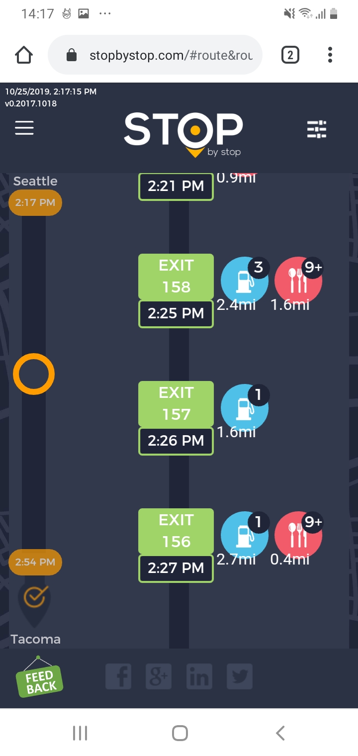 4. ExitPagesNavigation. A. Navigate to test_server/ B. Type Seattle to Tacoma route and navigate. C. Click on first exit. Verify that exit page opens and both - gas stations and restaurants are shown. Click back button in the browser to go back. D. Click on restaurant icon for the same exit and verify that same exit opens, but only restaurants are shown. Go back. E. Click on gas station icon for the same exit and verify that same exit opens, but only gas stations are shown. F. Verify that clicking on Phone icon opens Phone application. Some of the items (but not all of them) will have Yelp icon displayed next to them. Verify that clicking on Yelp icon navigates to Yelp website. Take a screenshot from Yelp website. |