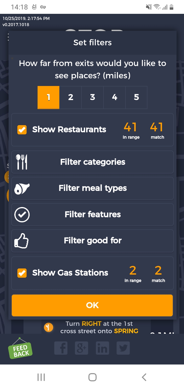 6. FiltersCategories. A. Navigate to test_server/route/47.68950,-122.03859-to-tacoma-wa-united-states. B. Click on Filters. C. Pick 5 miles from exit D. Unselect gas stations E. Leave restaurants selected. F. Click Filter categories select clear all, then select American(traditional) only. G. Click OK to close Filters. Take screenshot. |