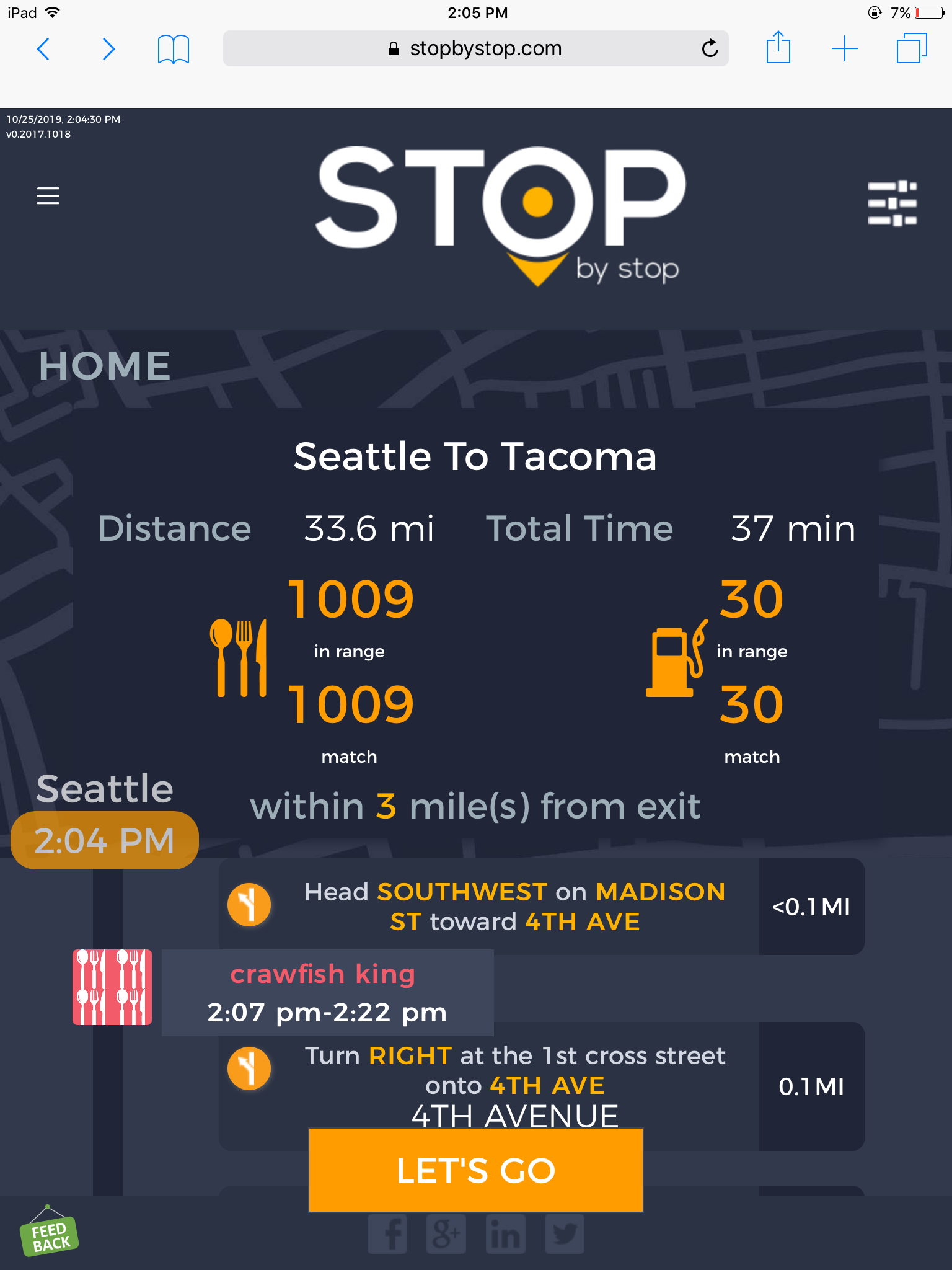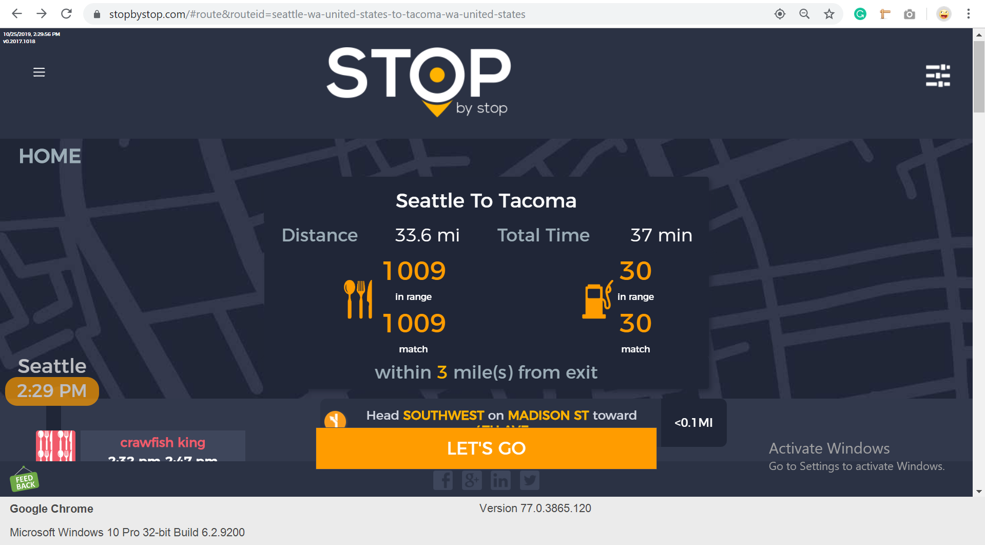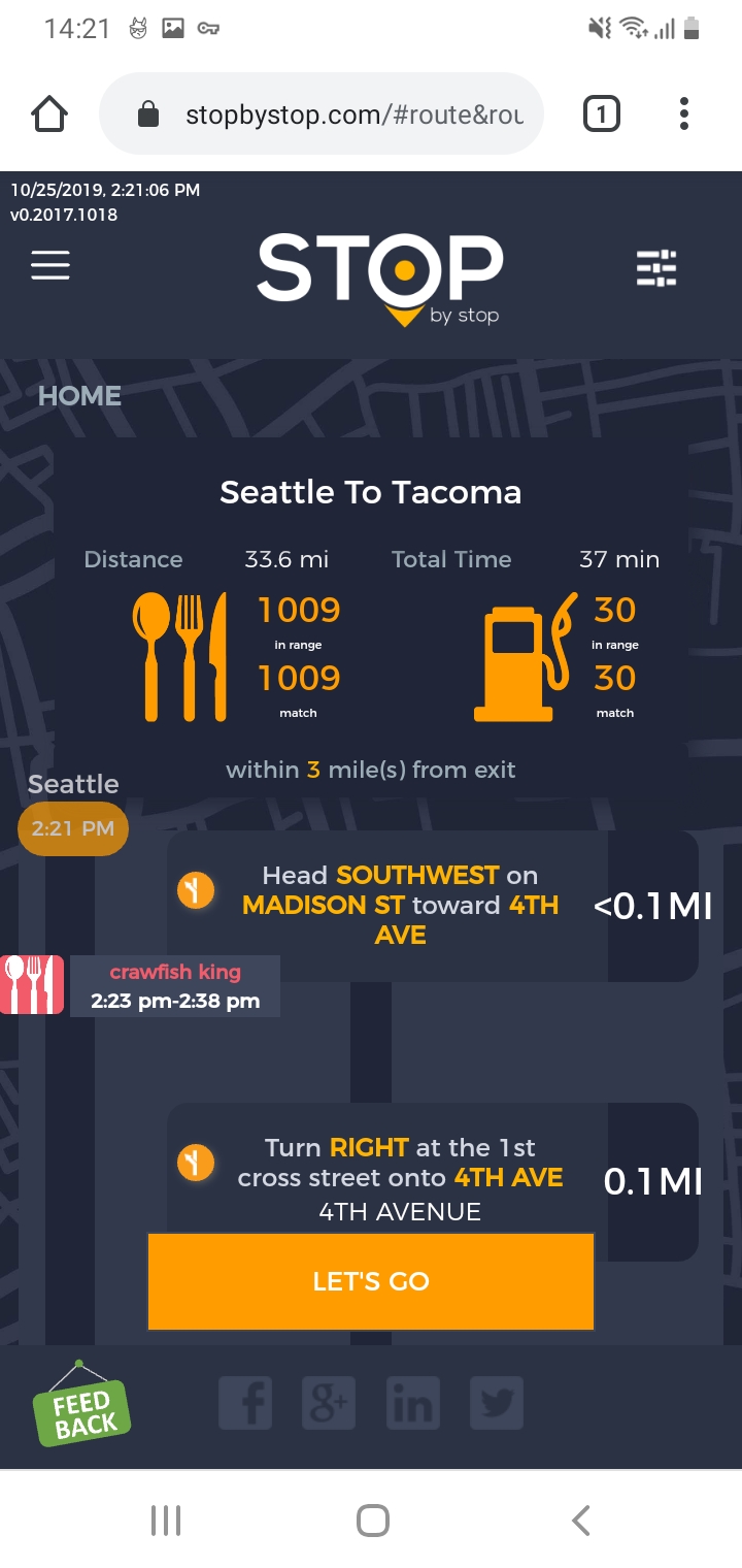 8. POISelectionGoToRoute. A. In the new browser tab open Seattle to Tacoma route. Click on first exit in the road line. Exit page should open. B. On the exit page click on the any item. POI page should open. </br/>C. On the POI page click Add to route button. POI selection popup should open. D. Click Add to route. Route page should open. E. On the sidebar there should be an icon to indicate the the place you picked. F. Click on Let's go button at the bottom of the screen. Google maps should open. Take a screenshot. |