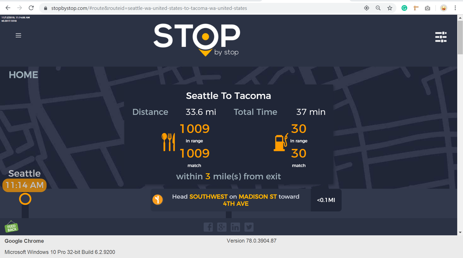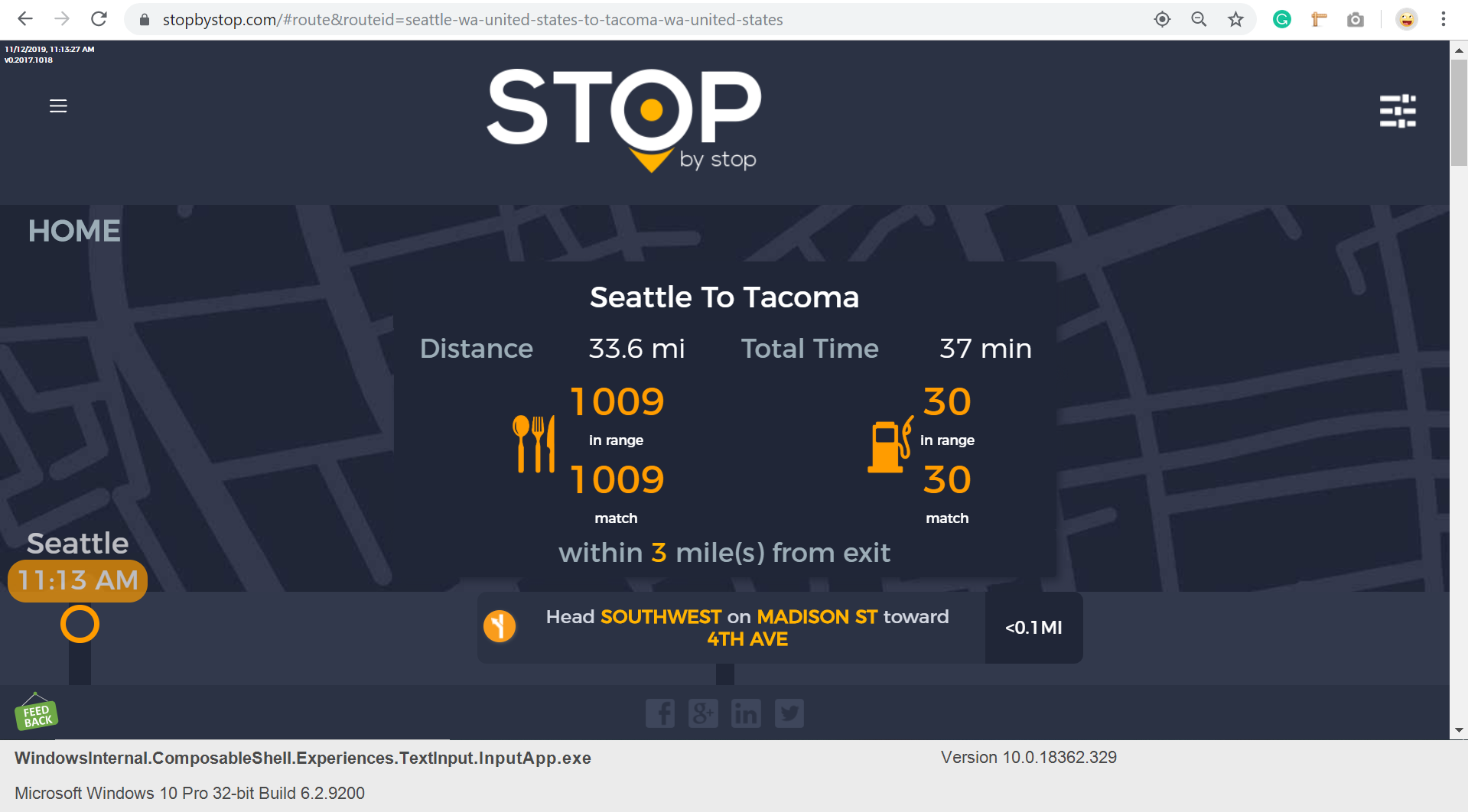 2. RoutePageRefesh. A. Navigate to test_server/ B. Type seat in the first textbox and pick Seattle from the dropdown. C. Type tac in the second textbox and pick Tacoma from the dropdown. D. Click View my trip. E. Route page should open showing exits with restaurants and gas station icons. F. Refresh the browser. Route page should open, NOT home page. Take screenshot. |