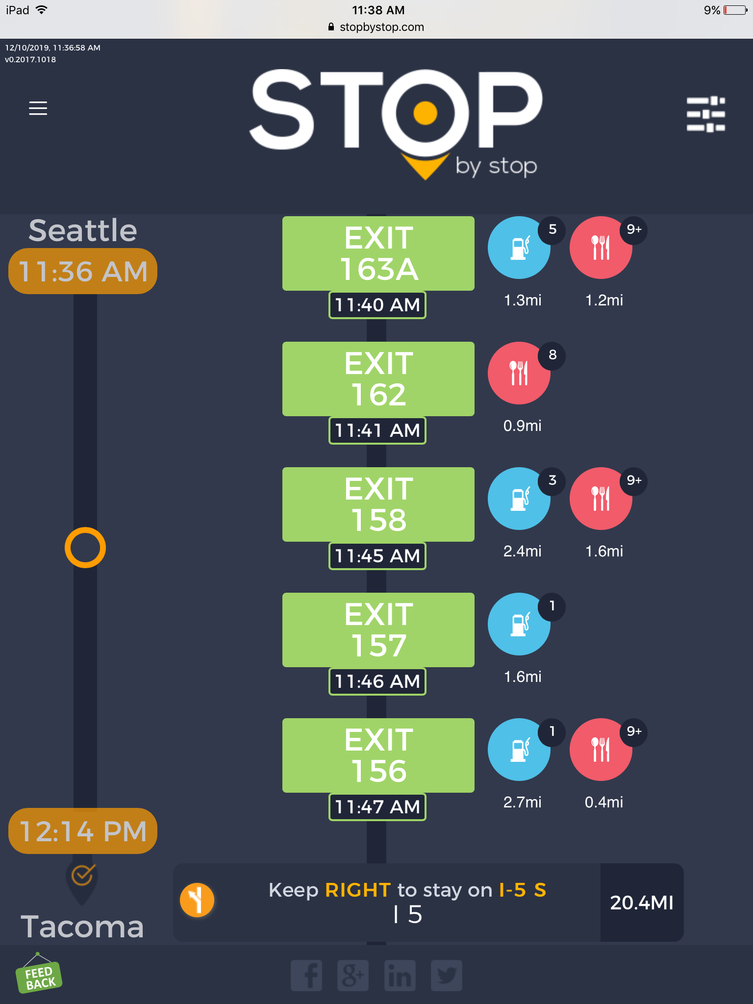 2. RoutePageRefesh. A. Navigate to test_server/ B. Type seat in the first textbox and pick Seattle from the dropdown. C. Type tac in the second textbox and pick Tacoma from the dropdown. D. Click View my trip. E. Route page should open showing exits with restaurants and gas station icons. F. Refresh the browser. Route page should open, NOT home page. Take screenshot. |