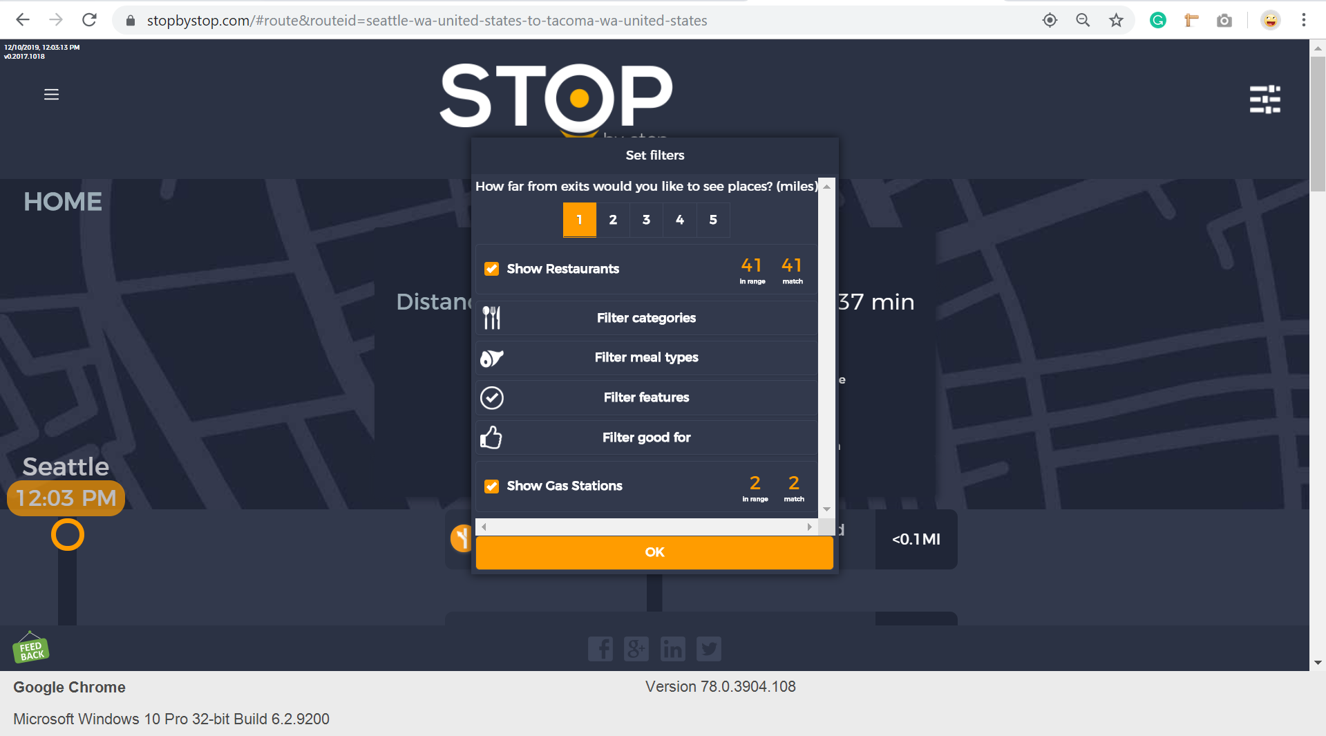 5. FiltersDistancePropagateToExit. A. Open Seattle to Tacoma route. B. Click on Filters and select 1 mile from exit. C. Close Filters popup and navigate to exit page. D. On the exit page open Filters popup and verify that distance settings (1 mile from exit) from route page are propagated. E. Take screenshot. |