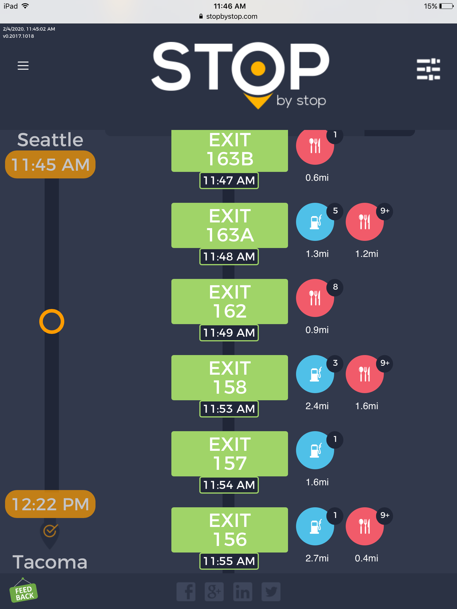 4. ExitPagesNavigation. A. Navigate to test_server/ B. Type Seattle to Tacoma route and navigate. C. Click on first exit. Verify that exit page opens and both - gas stations and restaurants are shown. Click back button in the browser to go back. D. Click on restaurant icon for the same exit and verify that same exit opens, but only restaurants are shown. Go back. E. Click on gas station icon for the same exit and verify that same exit opens, but only gas stations are shown. F. Verify that clicking on Phone icon opens Phone application. Some of the items (but not all of them) will have Yelp icon displayed next to them. Verify that clicking on Yelp icon navigates to Yelp website. Take a screenshot from Yelp website. |