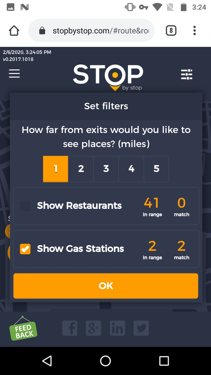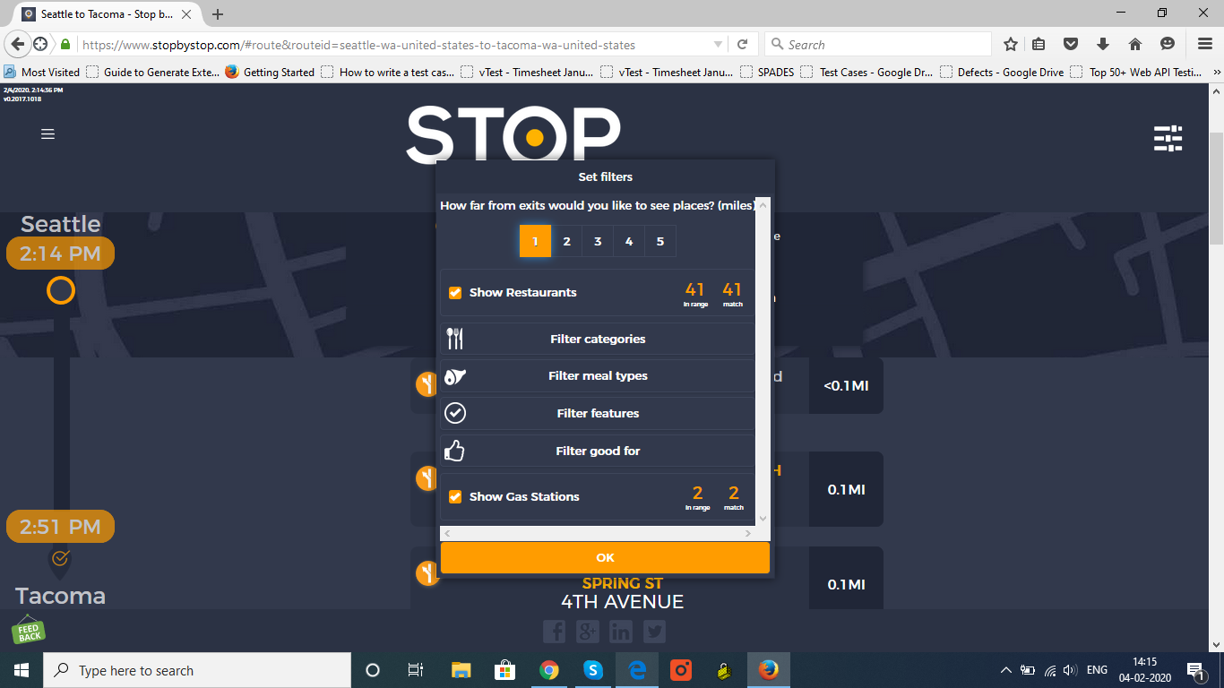 6. FiltersCategories. A. Navigate to test_server/route/47.68950,-122.03859-to-tacoma-wa-united-states. B. Click on Filters. C. Pick 5 miles from exit D. Unselect gas stations E. Leave restaurants selected. F. Click Filter categories select clear all, then select American(traditional) only. G. Click OK to close Filters. Take screenshot. |