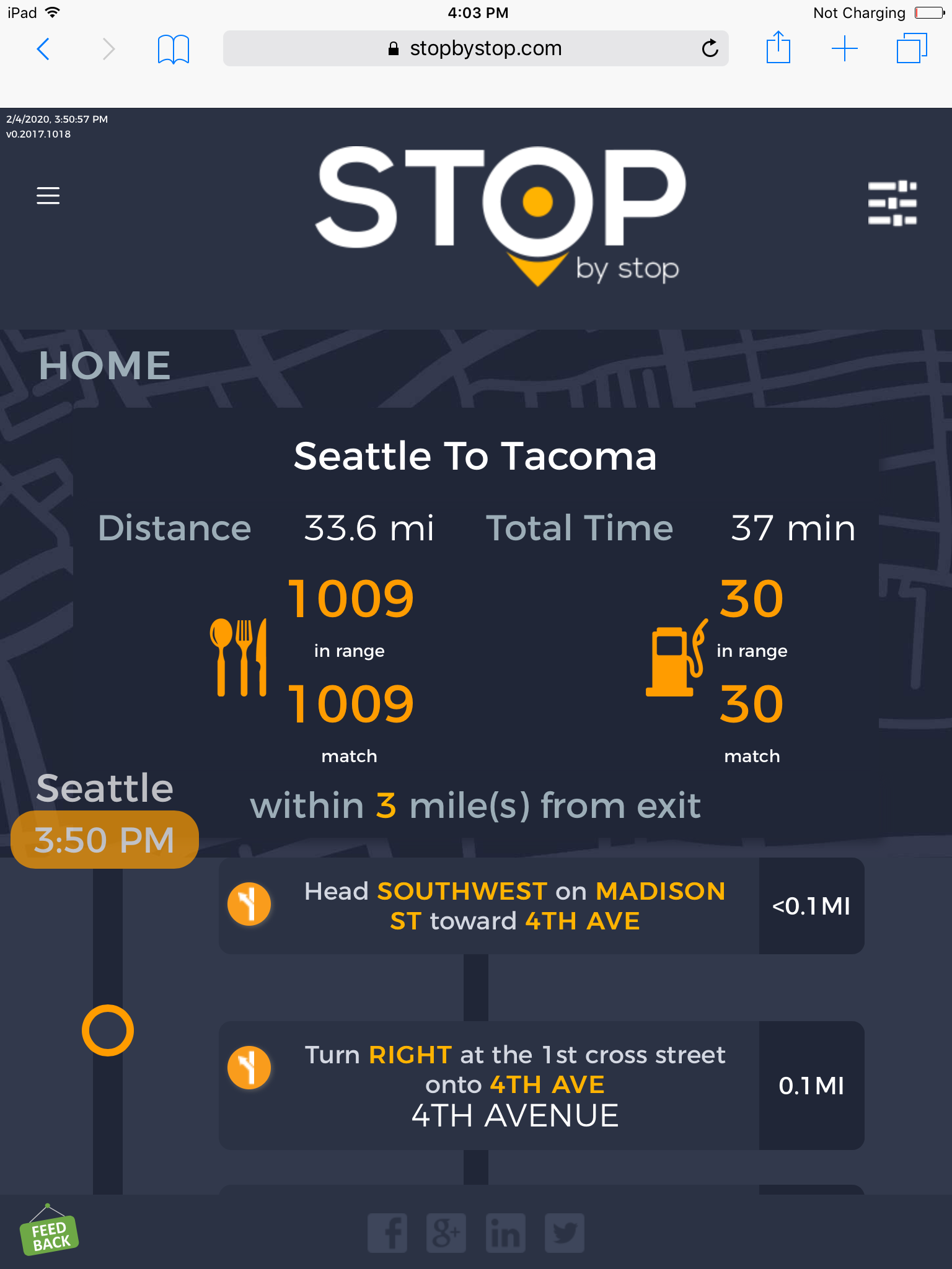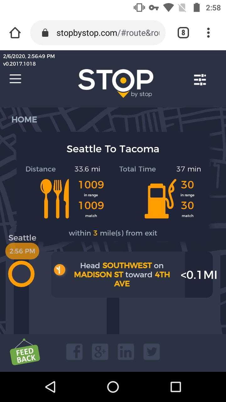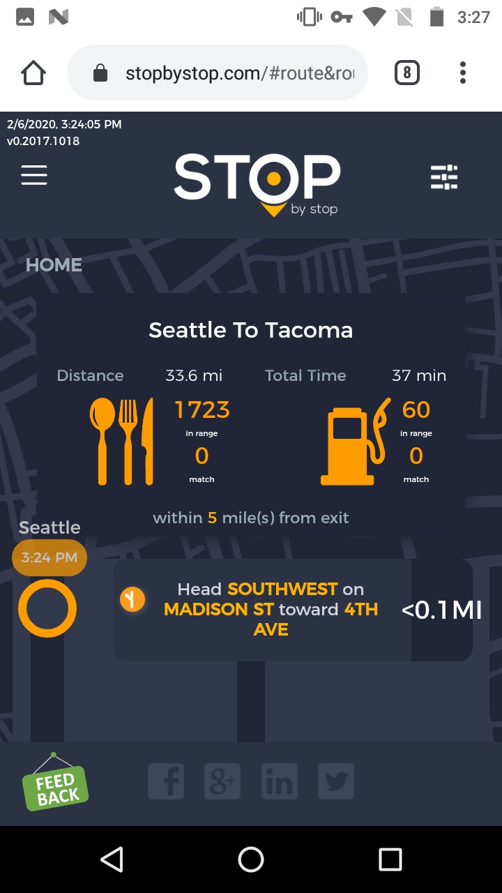 2. RoutePageRefesh. A. Navigate to test_server/ B. Type seat in the first textbox and pick Seattle from the dropdown. C. Type tac in the second textbox and pick Tacoma from the dropdown. D. Click View my trip. E. Route page should open showing exits with restaurants and gas station icons. F. Refresh the browser. Route page should open, NOT home page. Take screenshot. |