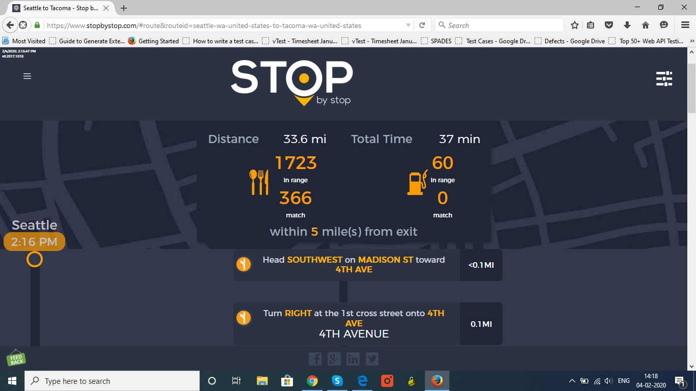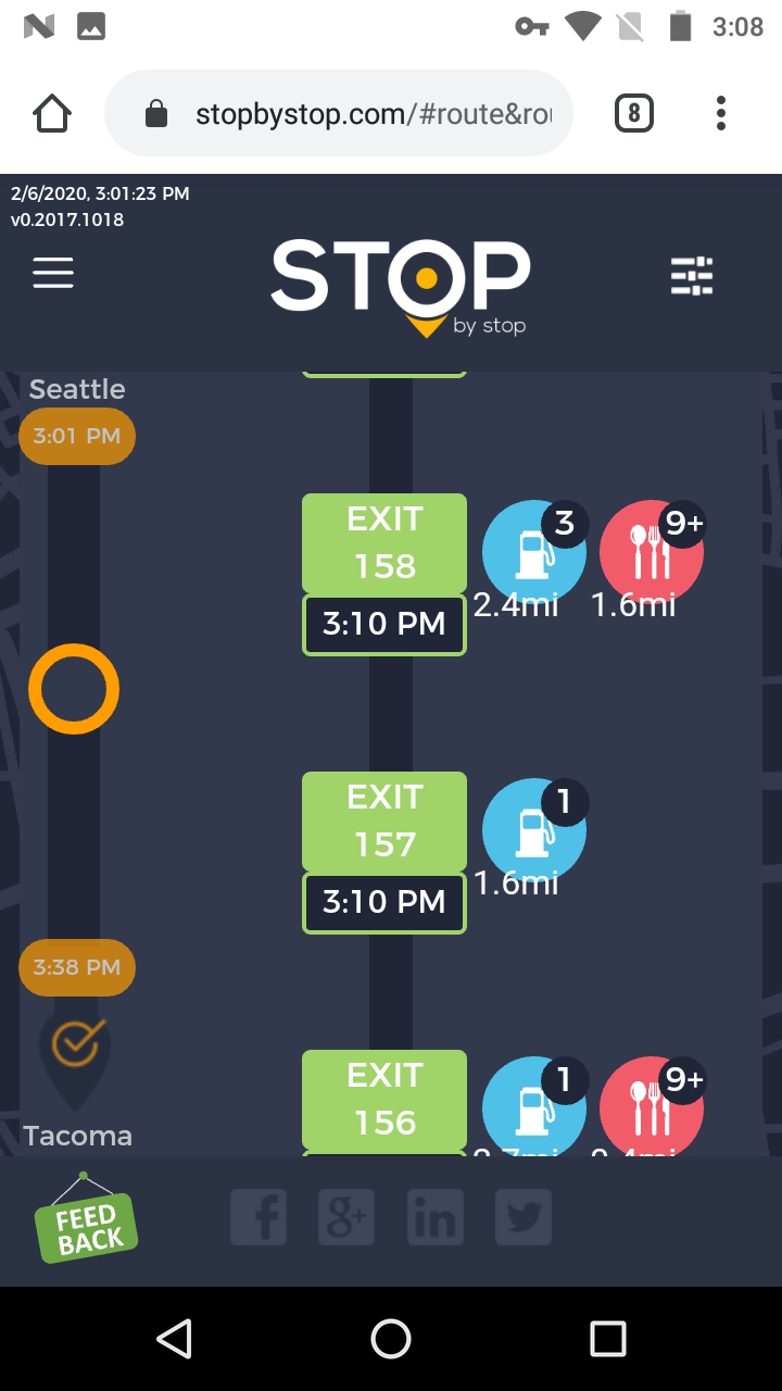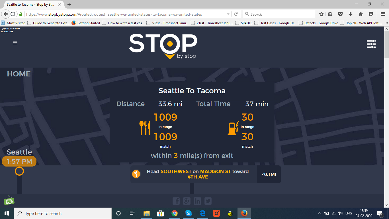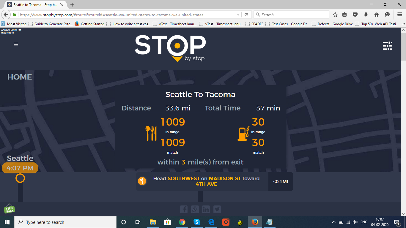 2. RoutePageRefesh. A. Navigate to test_server/ B. Type seat in the first textbox and pick Seattle from the dropdown. C. Type tac in the second textbox and pick Tacoma from the dropdown. D. Click View my trip. E. Route page should open showing exits with restaurants and gas station icons. F. Refresh the browser. Route page should open, NOT home page. Take screenshot. |