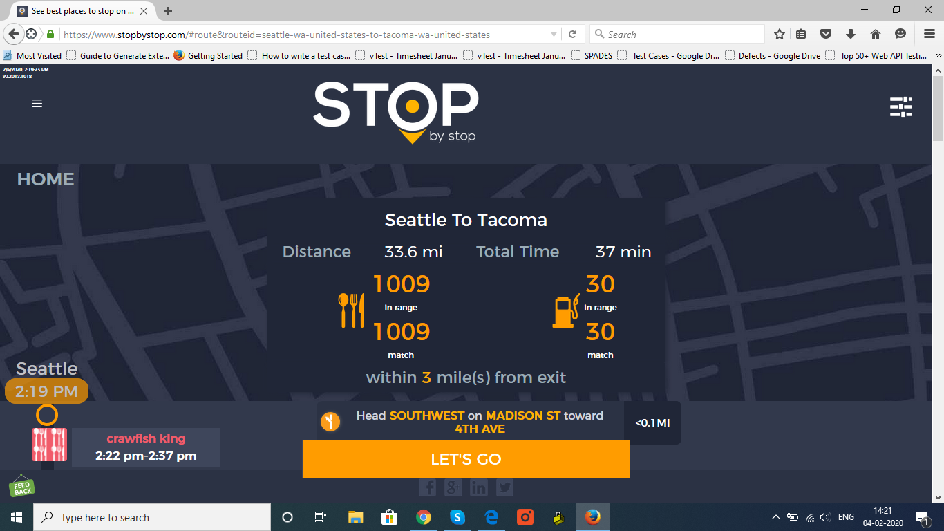 8. POISelectionGoToRoute. A. In the new browser tab open Seattle to Tacoma route. Click on first exit in the road line. Exit page should open. B. On the exit page click on the any item. POI page should open. </br/>C. On the POI page click Add to route button. POI selection popup should open. D. Click Add to route. Route page should open. E. On the sidebar there should be an icon to indicate the the place you picked. F. Click on Let's go button at the bottom of the screen. Google maps should open. Take a screenshot. |