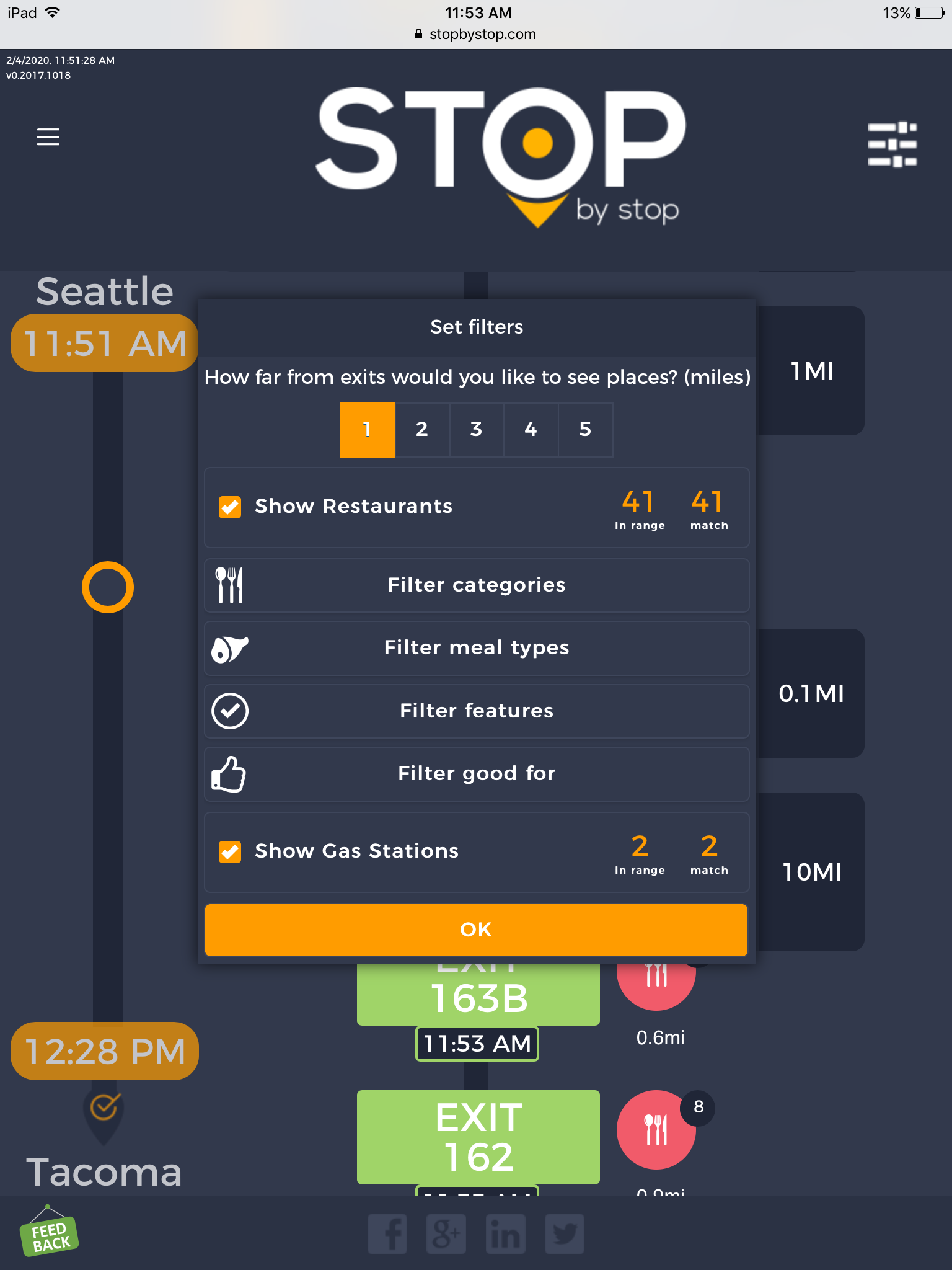 5. FiltersDistancePropagateToExit. A. Open Seattle to Tacoma route. B. Click on Filters and select 1 mile from exit. C. Close Filters popup and navigate to exit page. D. On the exit page open Filters popup and verify that distance settings (1 mile from exit) from route page are propagated. E. Take screenshot. |