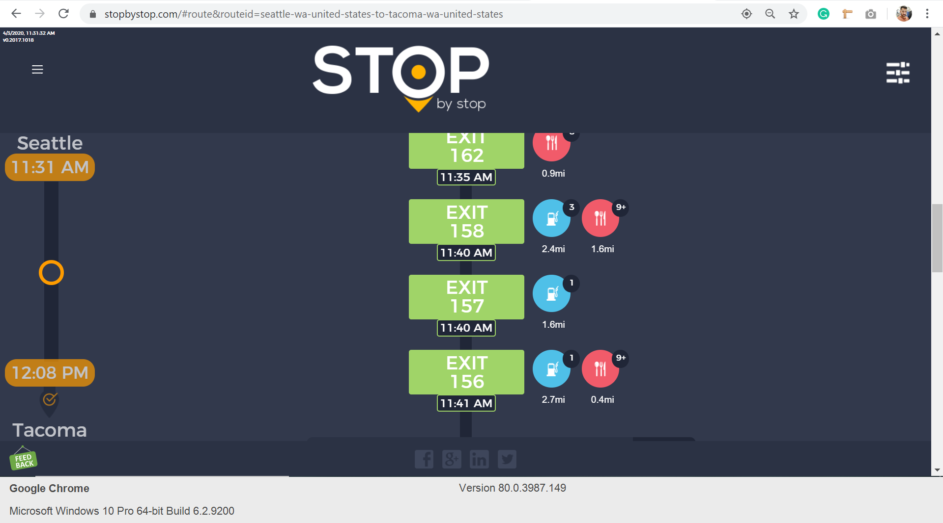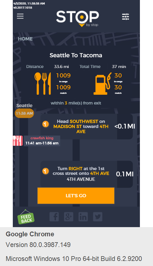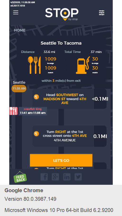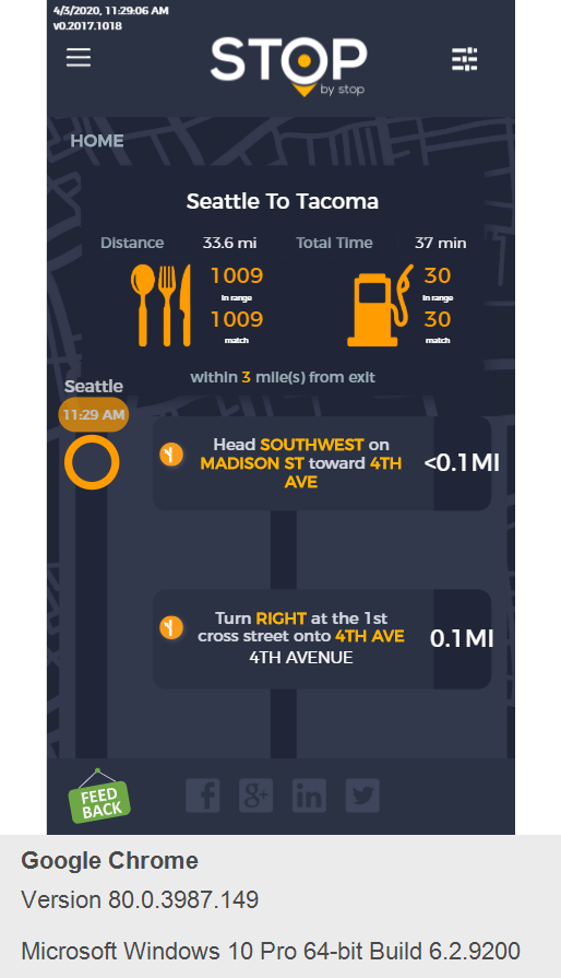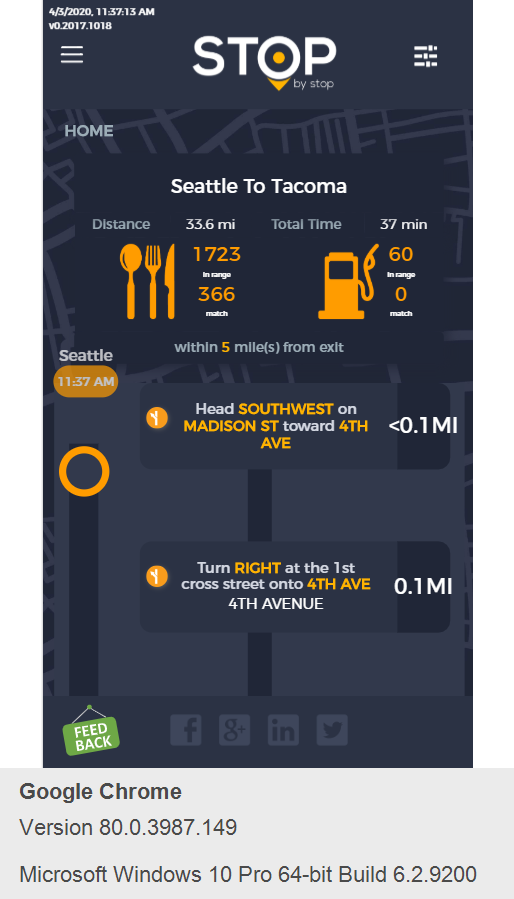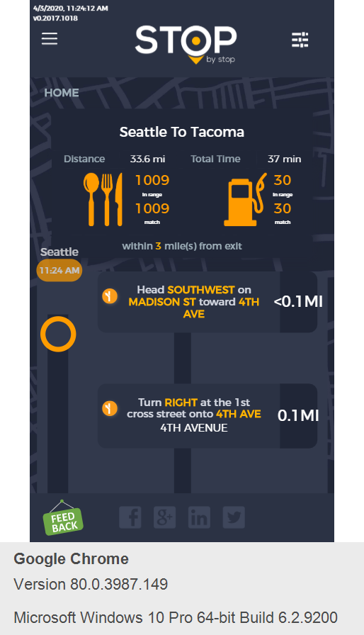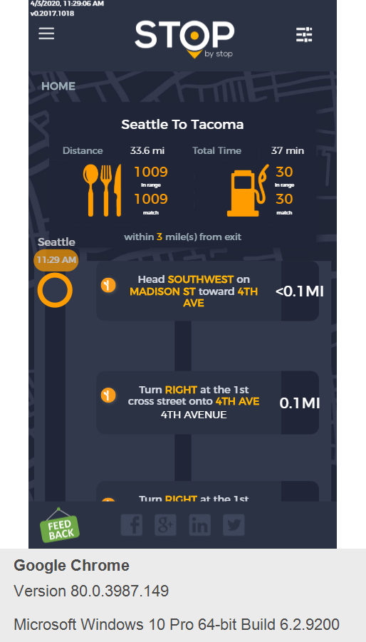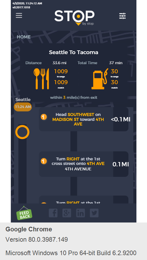 2. RoutePageRefesh. A. Navigate to test_server/ B. Type seat in the first textbox and pick Seattle from the dropdown. C. Type tac in the second textbox and pick Tacoma from the dropdown. D. Click View my trip. E. Route page should open showing exits with restaurants and gas station icons. F. Refresh the browser. Route page should open, NOT home page. Take screenshot. |