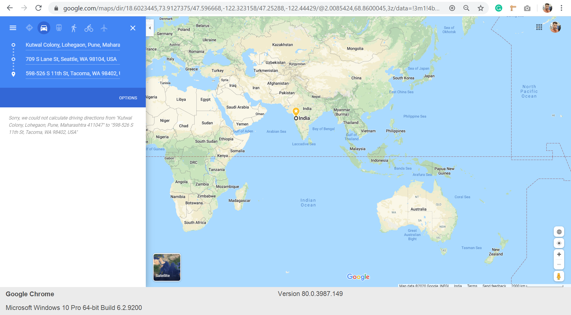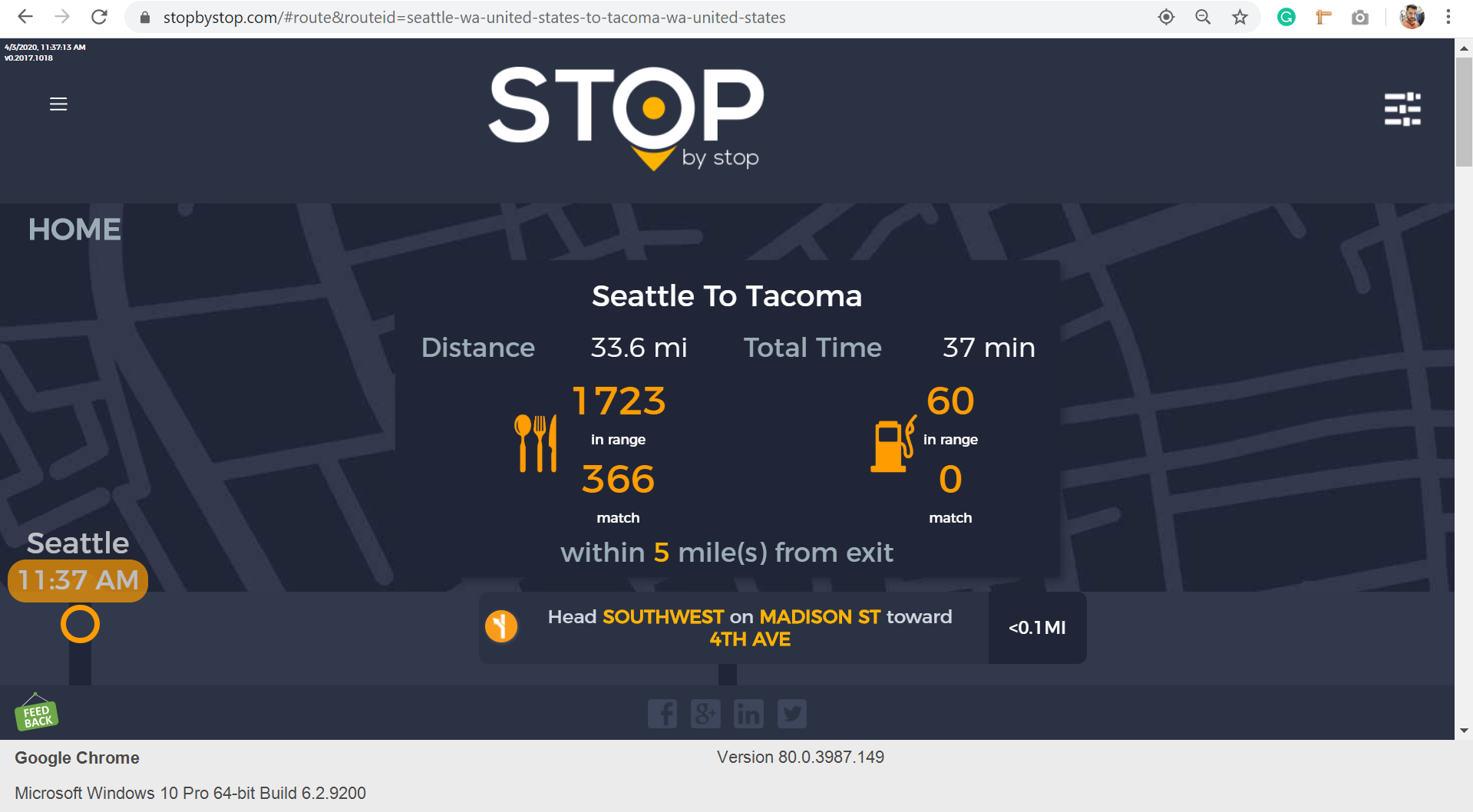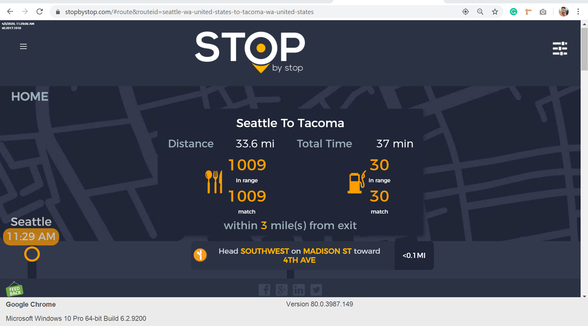 2. RoutePageRefesh. A. Navigate to test_server/ B. Type seat in the first textbox and pick Seattle from the dropdown. C. Type tac in the second textbox and pick Tacoma from the dropdown. D. Click View my trip. E. Route page should open showing exits with restaurants and gas station icons. F. Refresh the browser. Route page should open, NOT home page. Take screenshot. |
