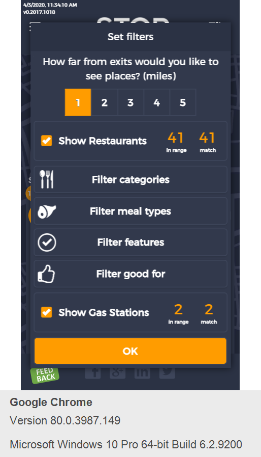 5. FiltersDistancePropagateToExit. A. Open Seattle to Tacoma route. B. Click on Filters and select 1 mile from exit. C. Close Filters popup and navigate to exit page. D. On the exit page open Filters popup and verify that distance settings (1 mile from exit) from route page are propagated. E. Take screenshot. |