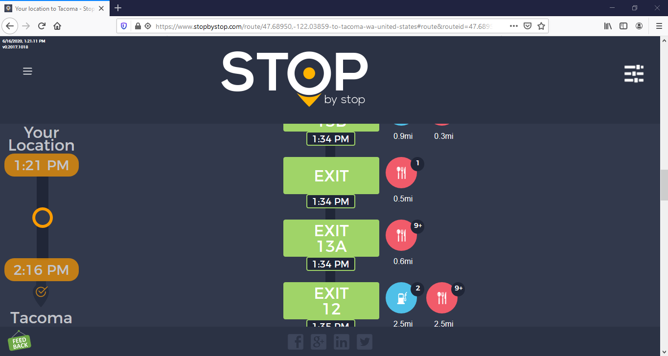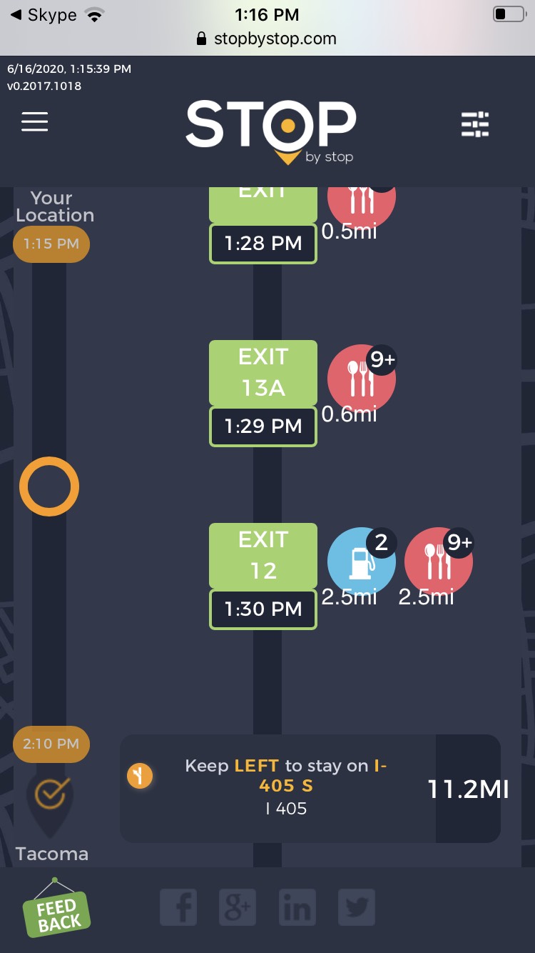 4. ExitPagesNavigation. A. Navigate to test_server/ B. Type Seattle to Tacoma route and navigate. C. Click on first exit. Verify that exit page opens and both - gas stations and restaurants are shown. Click back button in the browser to go back. D. Click on restaurant icon for the same exit and verify that same exit opens, but only restaurants are shown. Go back. E. Click on gas station icon for the same exit and verify that same exit opens, but only gas stations are shown. F. Verify that clicking on Phone icon opens Phone application. Some of the items (but not all of them) will have Yelp icon displayed next to them. Verify that clicking on Yelp icon navigates to Yelp website. Take a screenshot from Yelp website. |