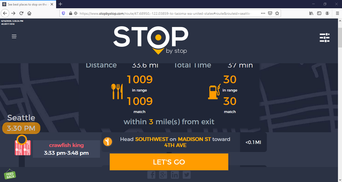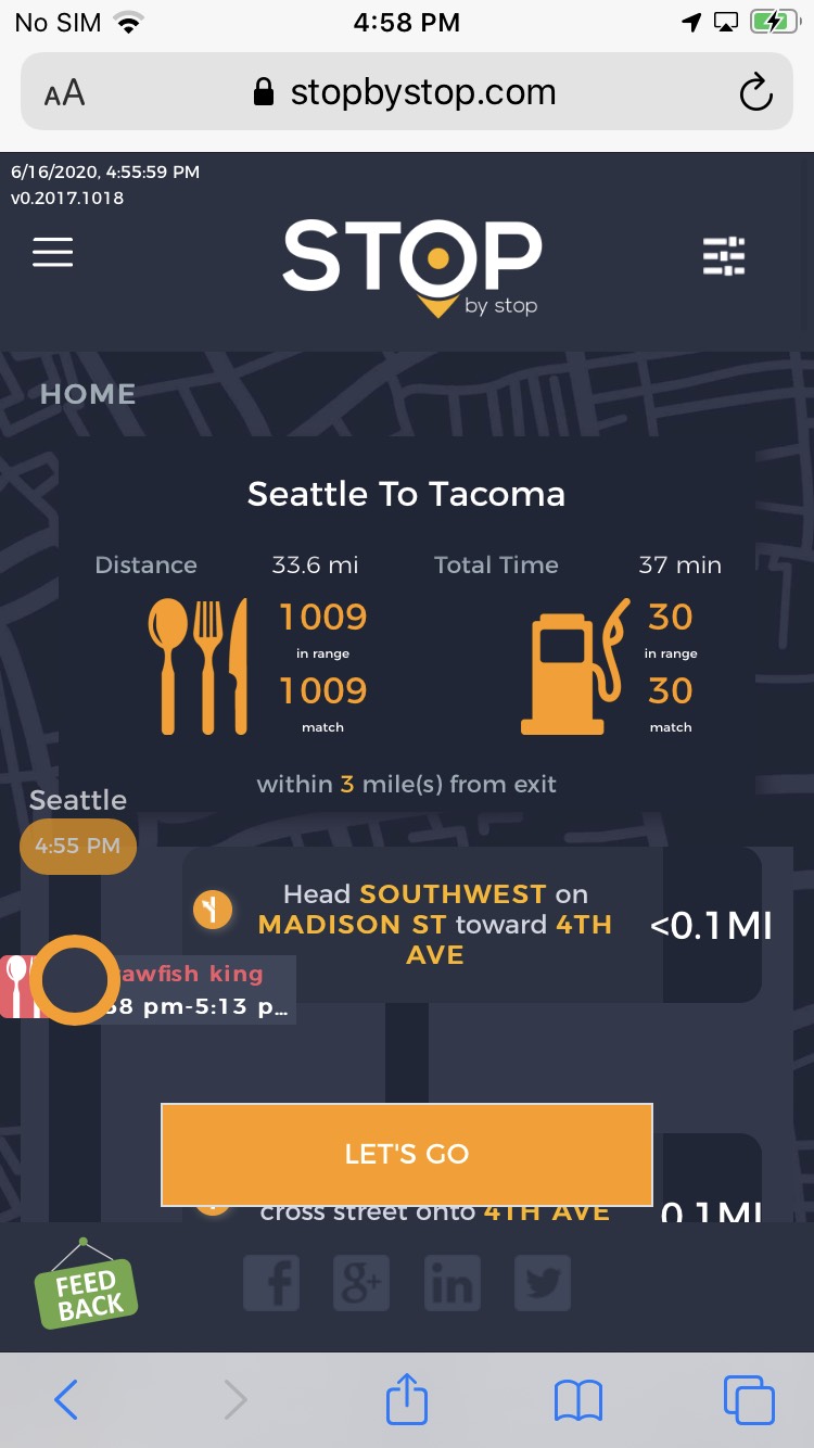 8. POISelectionGoToRoute. A. In the new browser tab open Seattle to Tacoma route. Click on first exit in the road line. Exit page should open. B. On the exit page click on the any item. POI page should open. </br/>C. On the POI page click Add to route button. POI selection popup should open. D. Click Add to route. Route page should open. E. On the sidebar there should be an icon to indicate the the place you picked. F. Click on Let's go button at the bottom of the screen. Google maps should open. Take a screenshot. |