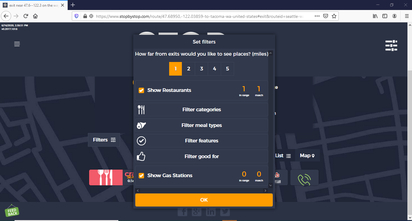 6. FiltersCategories. A. Navigate to test_server/route/47.68950,-122.03859-to-tacoma-wa-united-states. B. Click on Filters. C. Pick 5 miles from exit D. Unselect gas stations E. Leave restaurants selected. F. Click Filter categories select clear all, then select American(traditional) only. G. Click OK to close Filters. Take screenshot. |