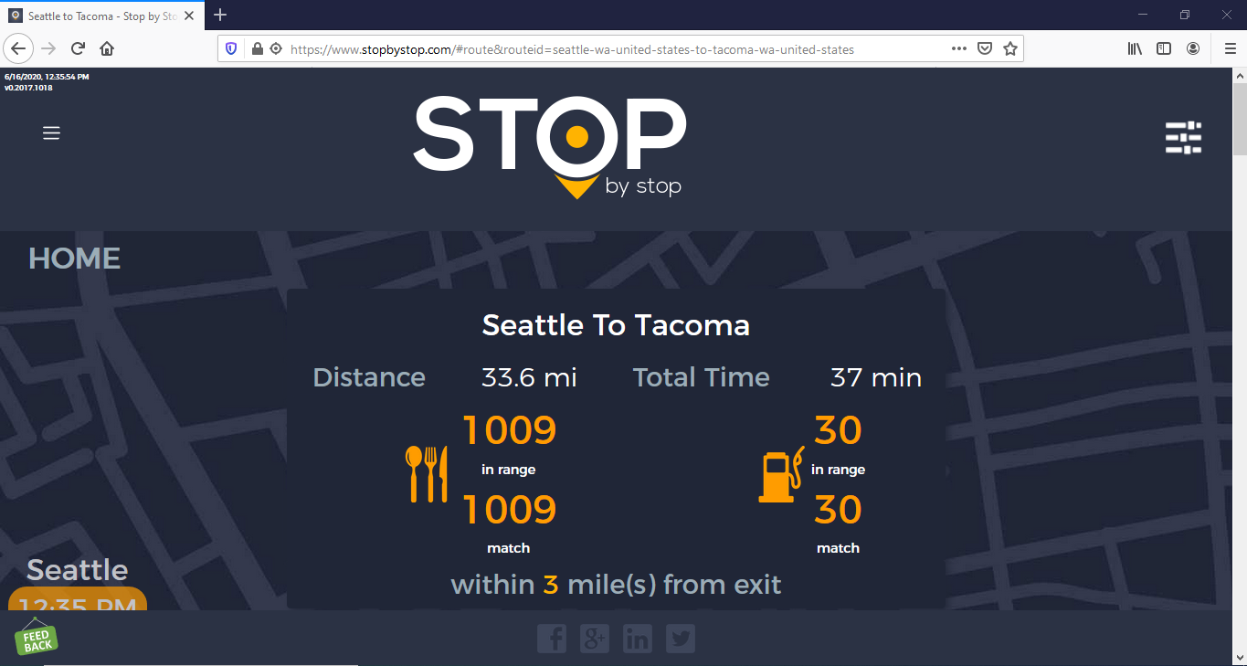2. RoutePageRefesh. A. Navigate to test_server/ B. Type seat in the first textbox and pick Seattle from the dropdown. C. Type tac in the second textbox and pick Tacoma from the dropdown. D. Click View my trip. E. Route page should open showing exits with restaurants and gas station icons. F. Refresh the browser. Route page should open, NOT home page. Take screenshot. |