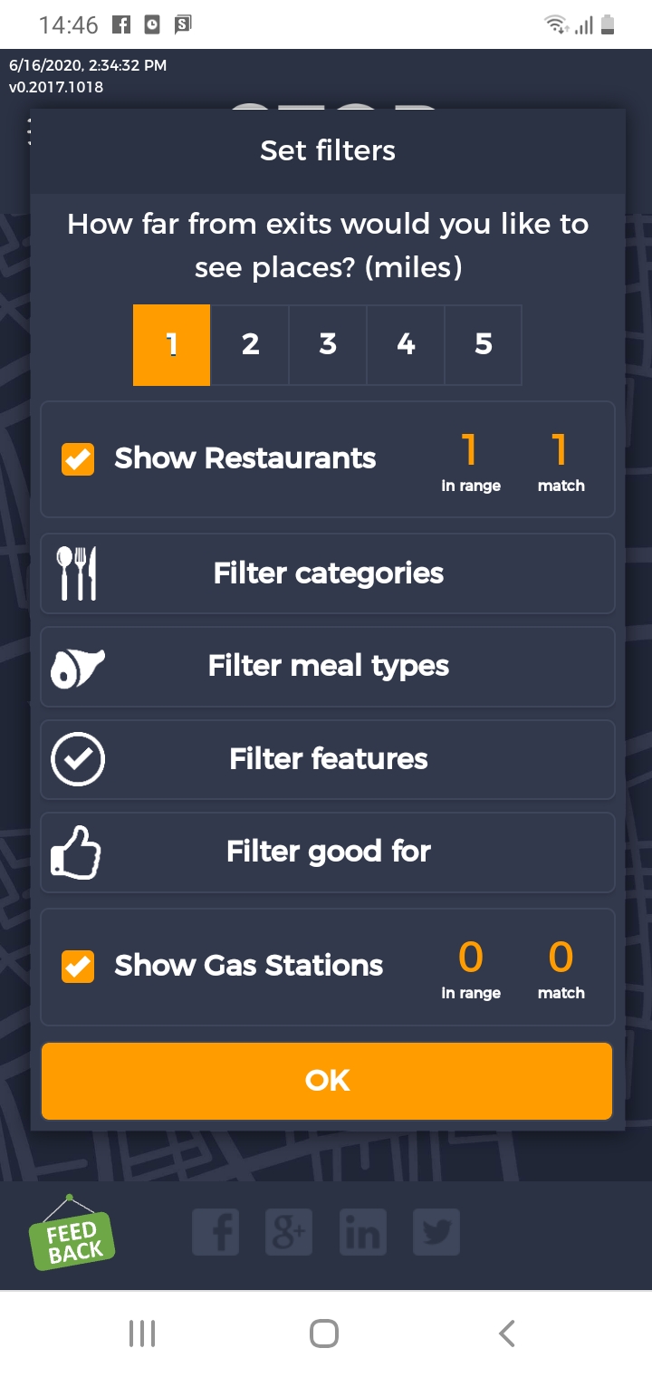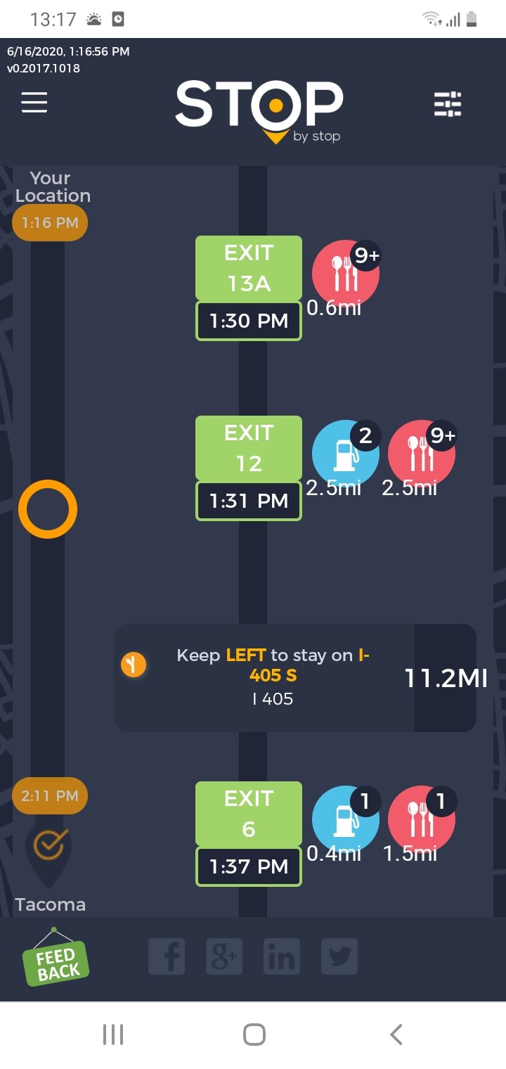 5. FiltersDistancePropagateToExit. A. Open Seattle to Tacoma route. B. Click on Filters and select 1 mile from exit. C. Close Filters popup and navigate to exit page. D. On the exit page open Filters popup and verify that distance settings (1 mile from exit) from route page are propagated. E. Take screenshot. |