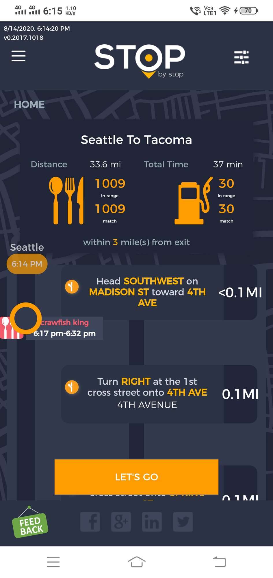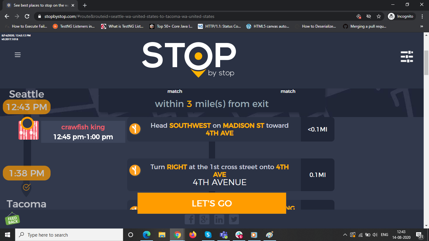 8. POISelectionGoToRoute. A. In the new browser tab open Seattle to Tacoma route. Click on first exit in the road line. Exit page should open. B. On the exit page click on the any item. POI page should open. </br/>C. On the POI page click Add to route button. POI selection popup should open. D. Click Add to route. Route page should open. E. On the sidebar there should be an icon to indicate the the place you picked. F. Click on Let's go button at the bottom of the screen. Google maps should open. Take a screenshot. |