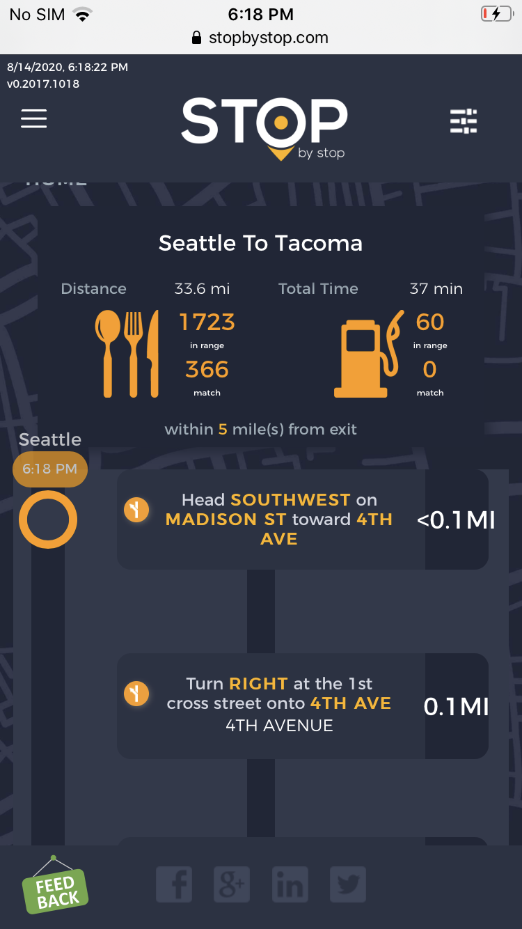 5. FiltersDistancePropagateToExit. A. Open Seattle to Tacoma route. B. Click on Filters and select 1 mile from exit. C. Close Filters popup and navigate to exit page. D. On the exit page open Filters popup and verify that distance settings (1 mile from exit) from route page are propagated. E. Take screenshot. |