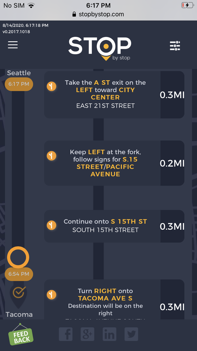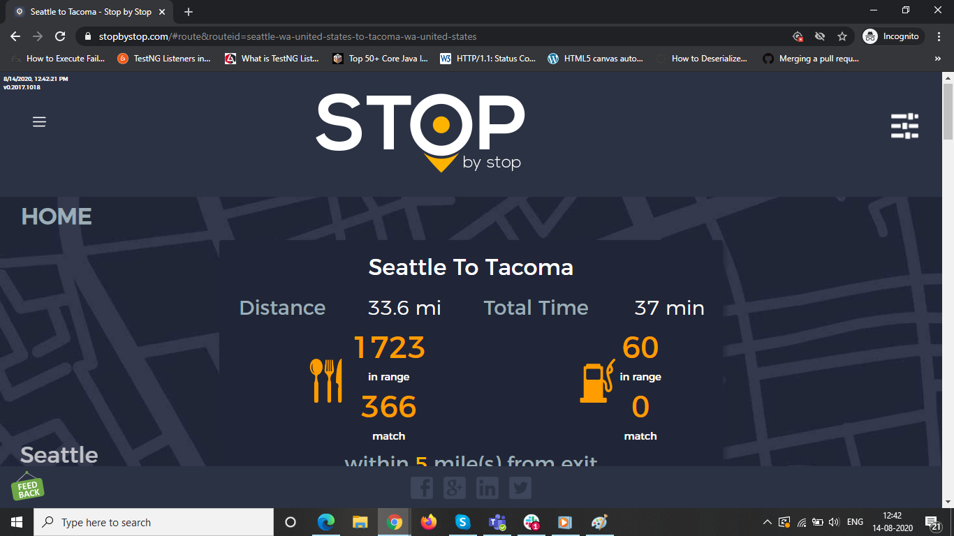 2. RoutePageRefesh. A. Navigate to test_server/ B. Type seat in the first textbox and pick Seattle from the dropdown. C. Type tac in the second textbox and pick Tacoma from the dropdown. D. Click View my trip. E. Route page should open showing exits with restaurants and gas station icons. F. Refresh the browser. Route page should open, NOT home page. Take screenshot. |
