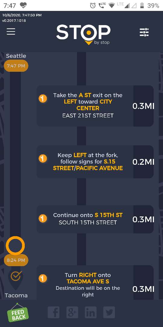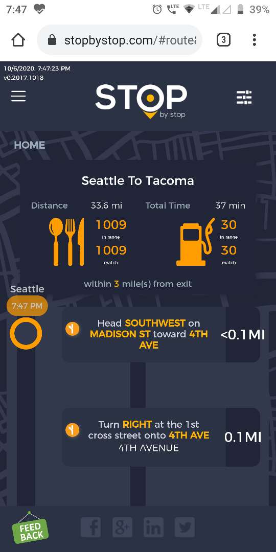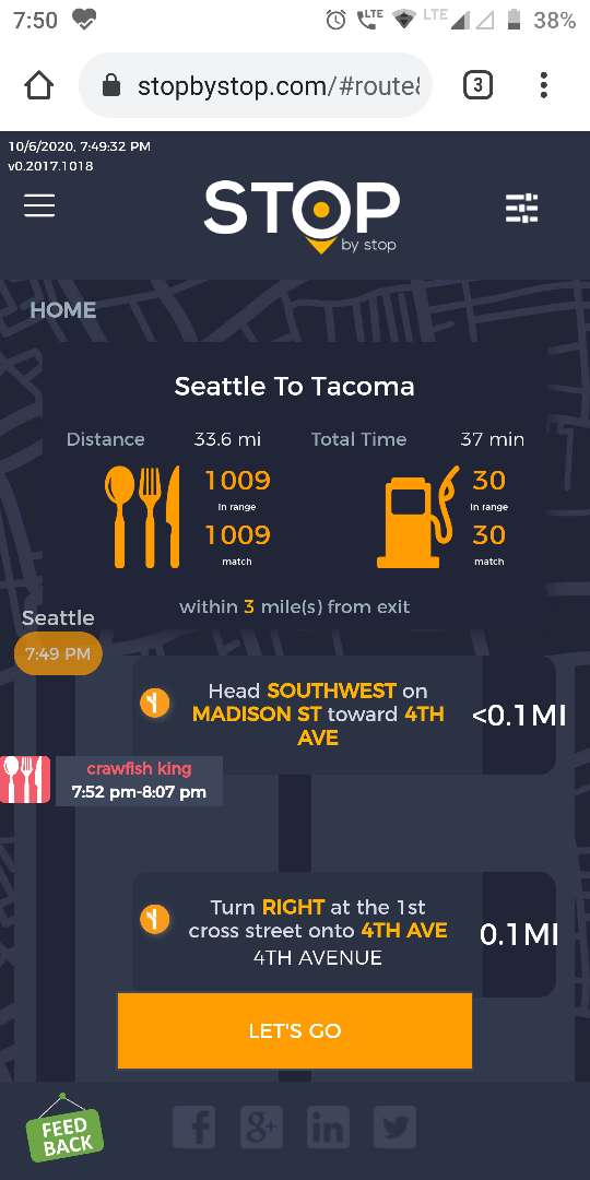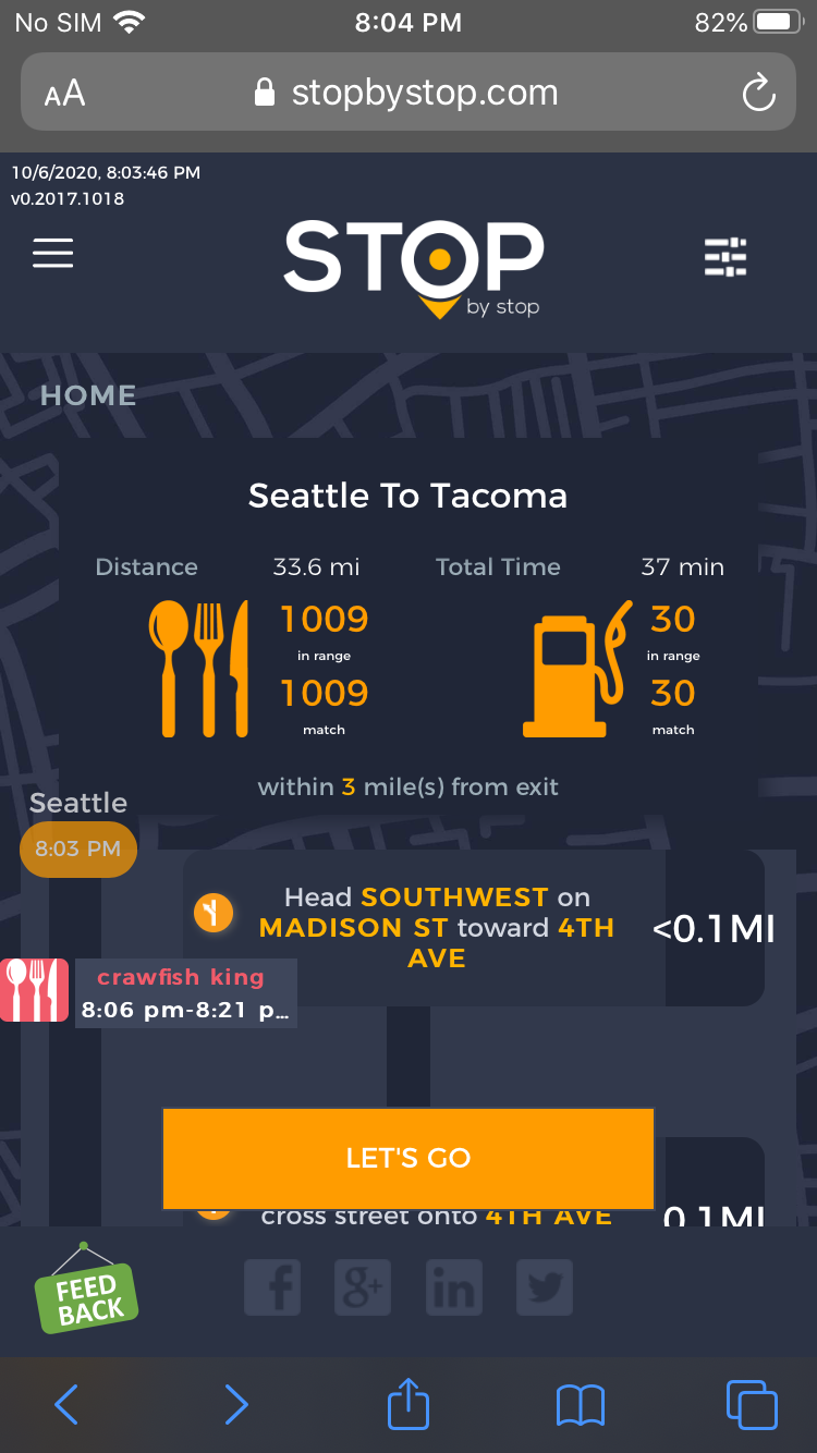 8. POISelectionGoToRoute. A. In the new browser tab open Seattle to Tacoma route. Click on first exit in the road line. Exit page should open. B. On the exit page click on the any item. POI page should open. </br/>C. On the POI page click Add to route button. POI selection popup should open. D. Click Add to route. Route page should open. E. On the sidebar there should be an icon to indicate the the place you picked. F. Click on Let's go button at the bottom of the screen. Google maps should open. Take a screenshot. |