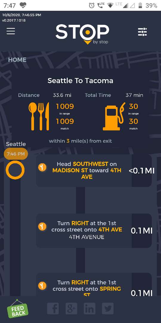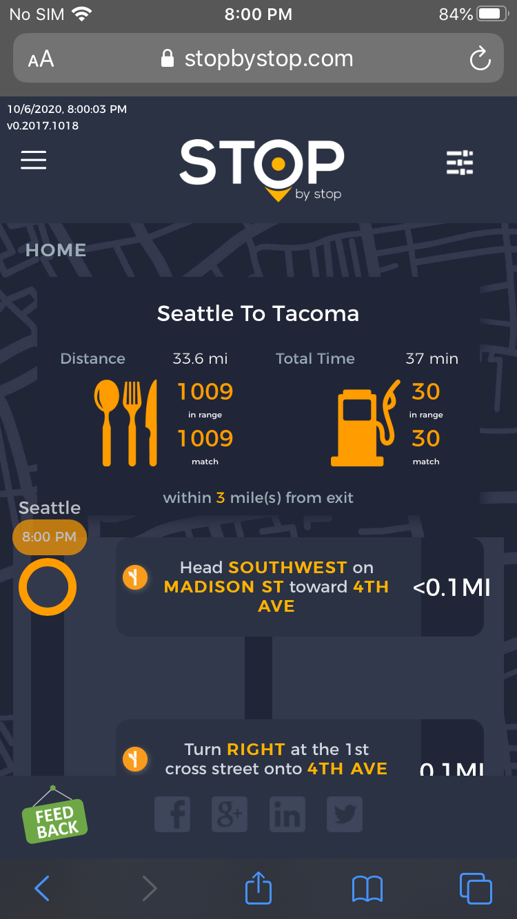 5. FiltersDistancePropagateToExit. A. Open Seattle to Tacoma route. B. Click on Filters and select 1 mile from exit. C. Close Filters popup and navigate to exit page. D. On the exit page open Filters popup and verify that distance settings (1 mile from exit) from route page are propagated. E. Take screenshot. |