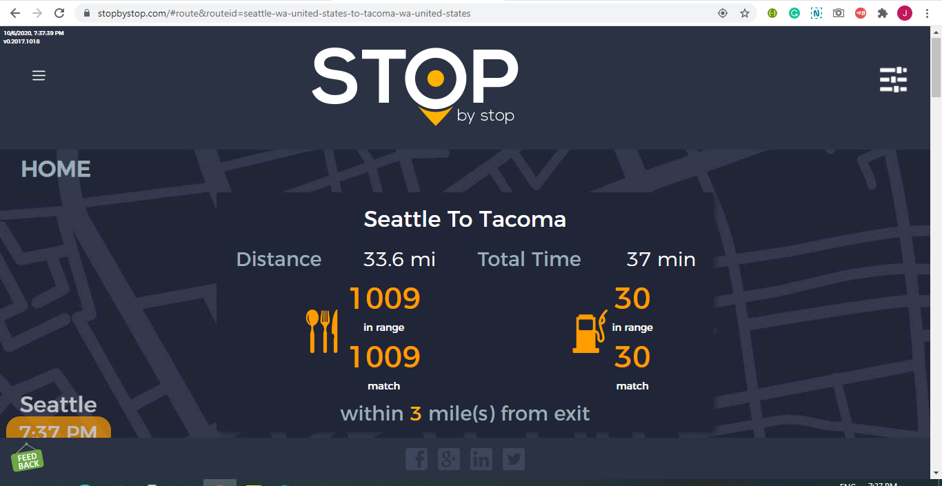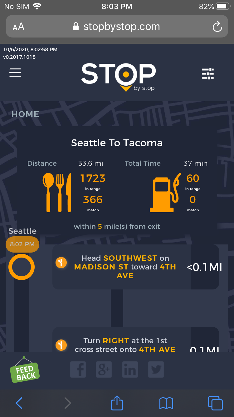 2. RoutePageRefesh. A. Navigate to test_server/ B. Type seat in the first textbox and pick Seattle from the dropdown. C. Type tac in the second textbox and pick Tacoma from the dropdown. D. Click View my trip. E. Route page should open showing exits with restaurants and gas station icons. F. Refresh the browser. Route page should open, NOT home page. Take screenshot. |