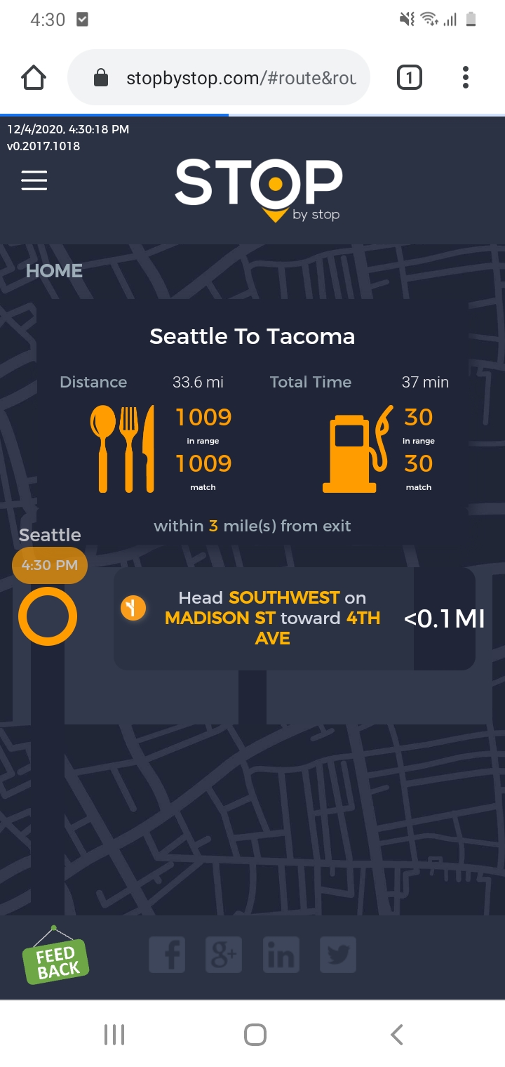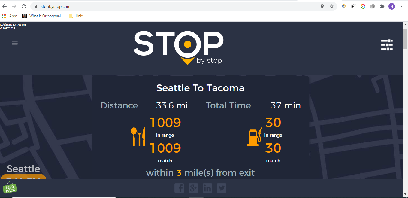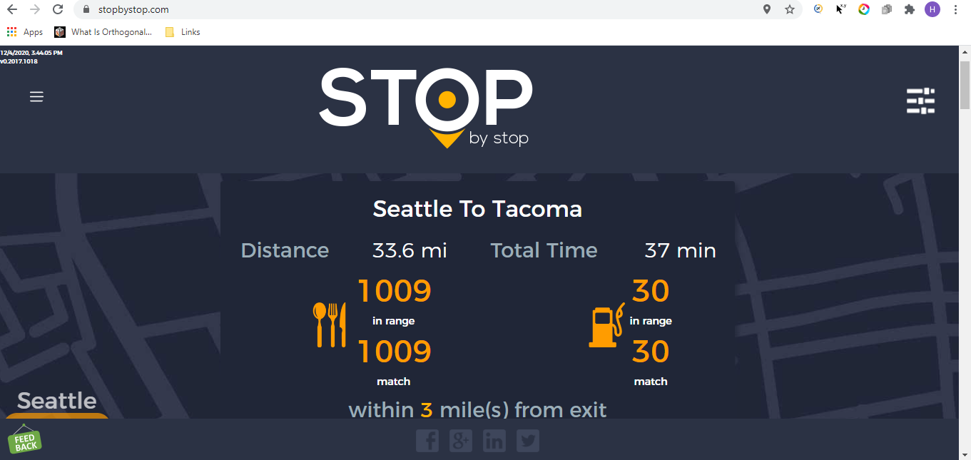 2. RoutePageRefesh. A. Navigate to test_server/ B. Type seat in the first textbox and pick Seattle from the dropdown. C. Type tac in the second textbox and pick Tacoma from the dropdown. D. Click View my trip. E. Route page should open showing exits with restaurants and gas station icons. F. Refresh the browser. Route page should open, NOT home page. Take screenshot. |