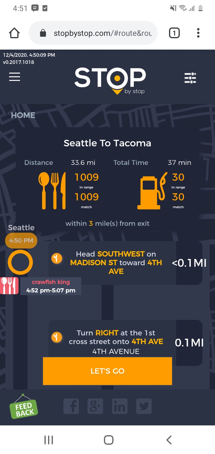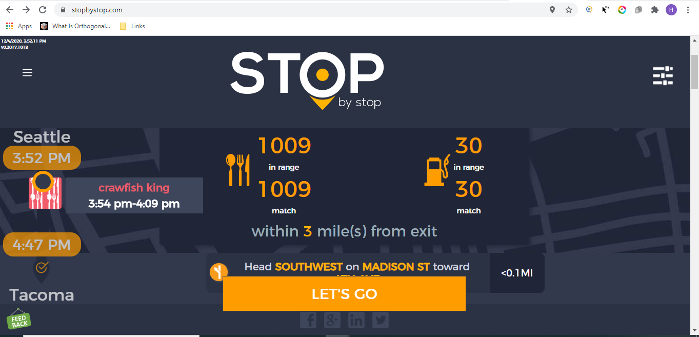 8. POISelectionGoToRoute. A. In the new browser tab open Seattle to Tacoma route. Click on first exit in the road line. Exit page should open. B. On the exit page click on the any item. POI page should open. </br/>C. On the POI page click Add to route button. POI selection popup should open. D. Click Add to route. Route page should open. E. On the sidebar there should be an icon to indicate the the place you picked. F. Click on Let's go button at the bottom of the screen. Google maps should open. Take a screenshot. |