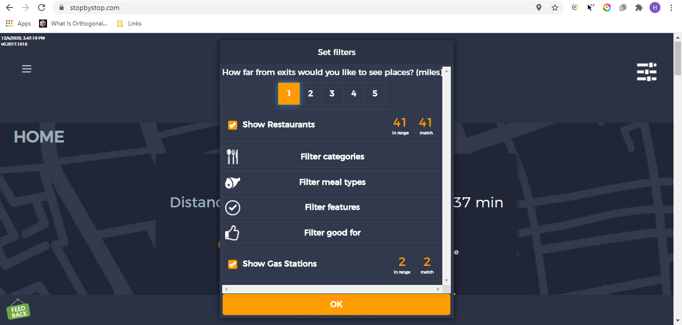 6. FiltersCategories. A. Navigate to test_server/route/47.68950,-122.03859-to-tacoma-wa-united-states. B. Click on Filters. C. Pick 5 miles from exit D. Unselect gas stations E. Leave restaurants selected. F. Click Filter categories select clear all, then select American(traditional) only. G. Click OK to close Filters. Take screenshot. |