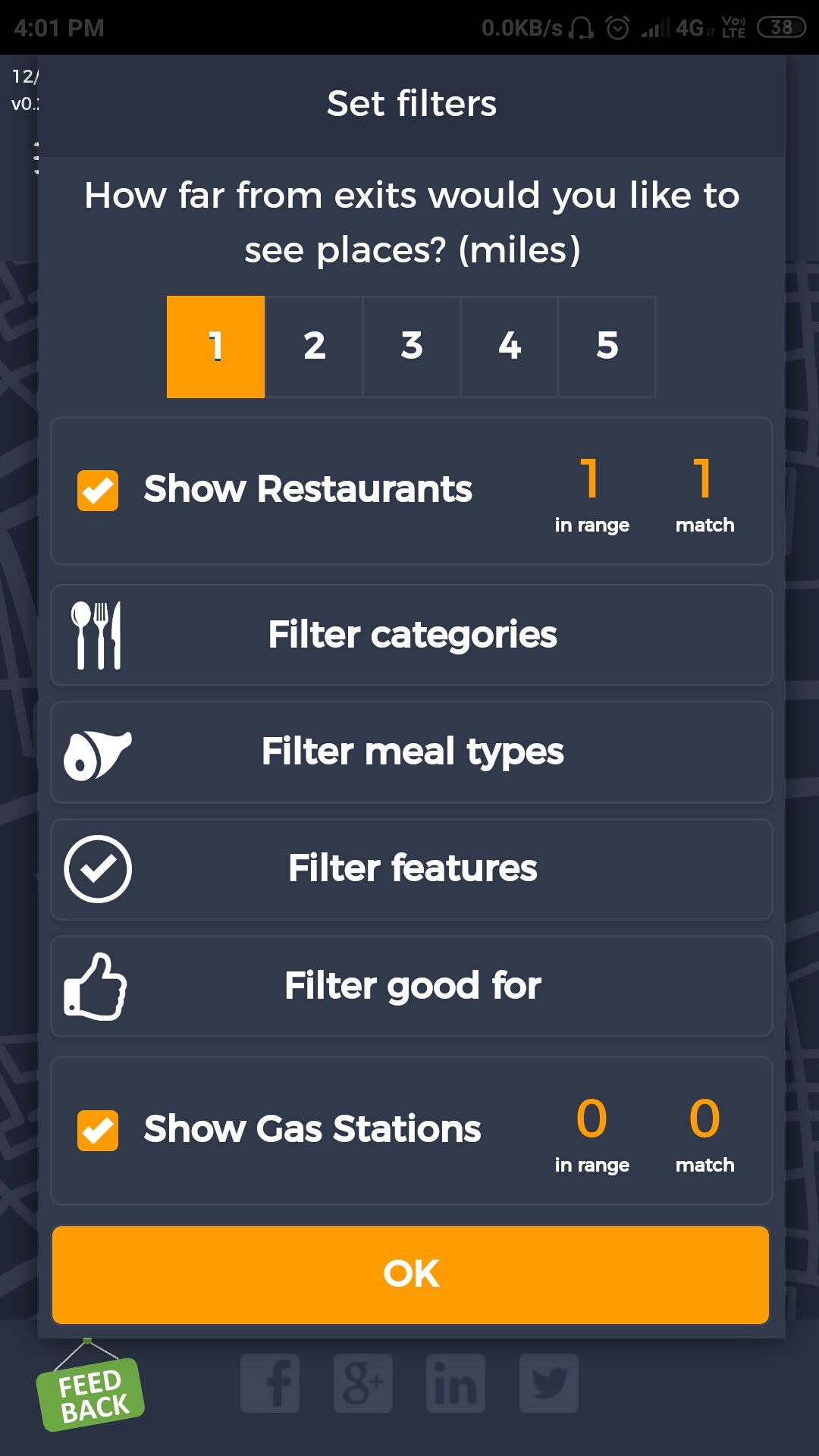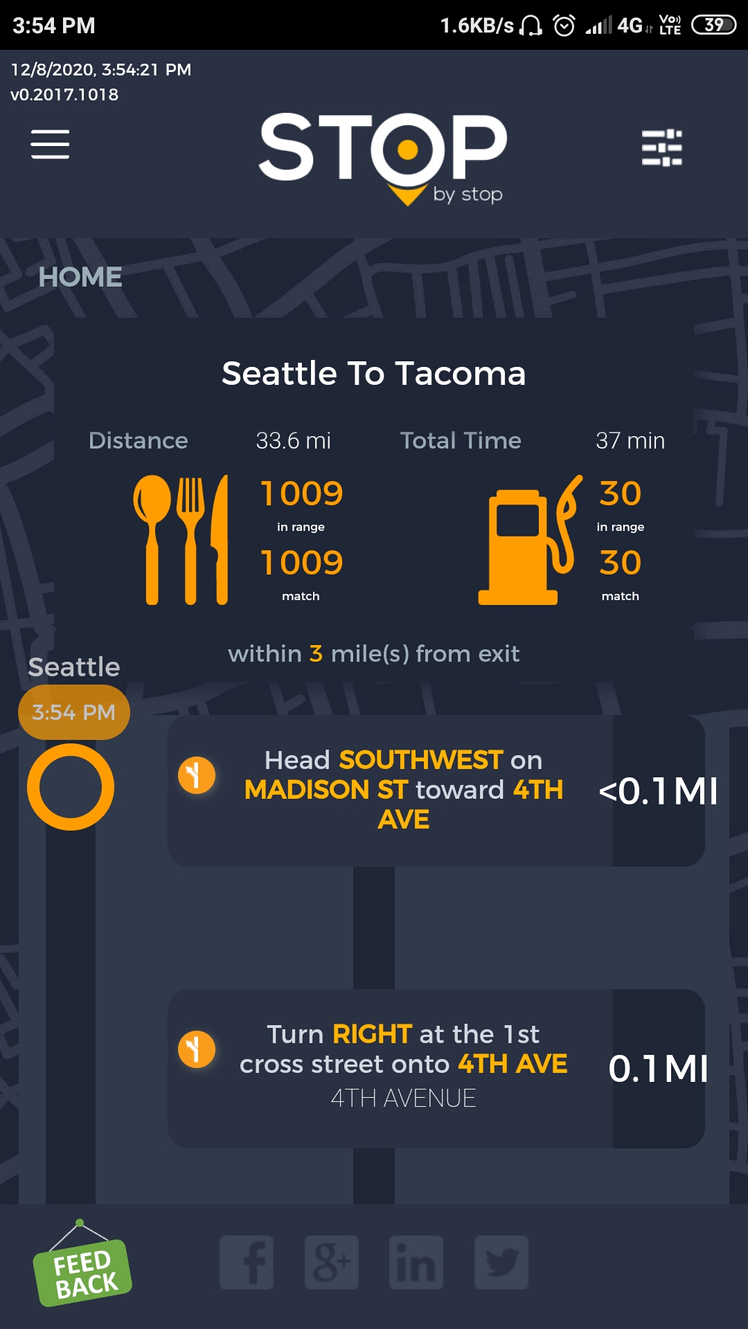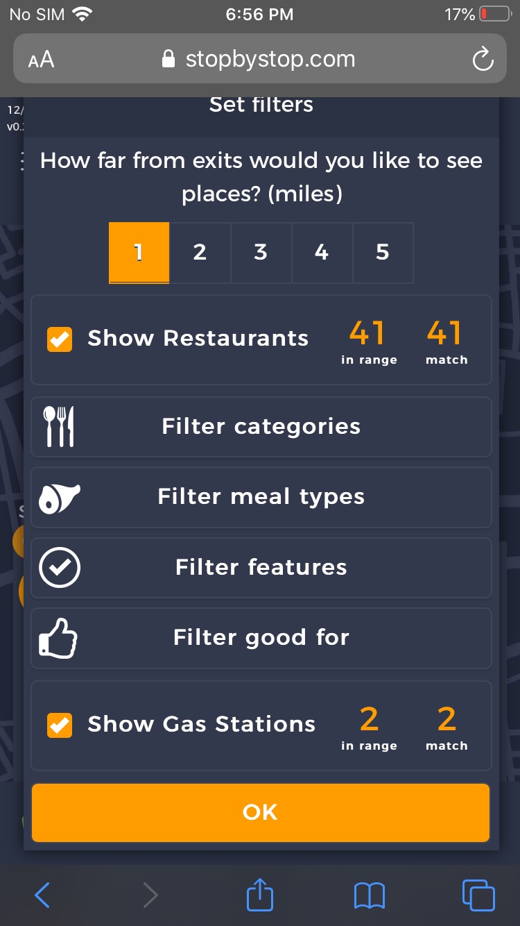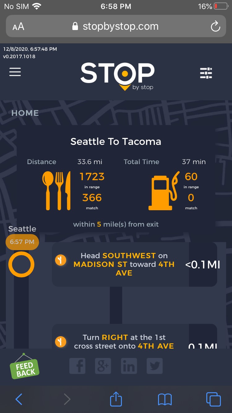5. FiltersDistancePropagateToExit. A. Open Seattle to Tacoma route. B. Click on Filters and select 1 mile from exit. C. Close Filters popup and navigate to exit page. D. On the exit page open Filters popup and verify that distance settings (1 mile from exit) from route page are propagated. E. Take screenshot. |