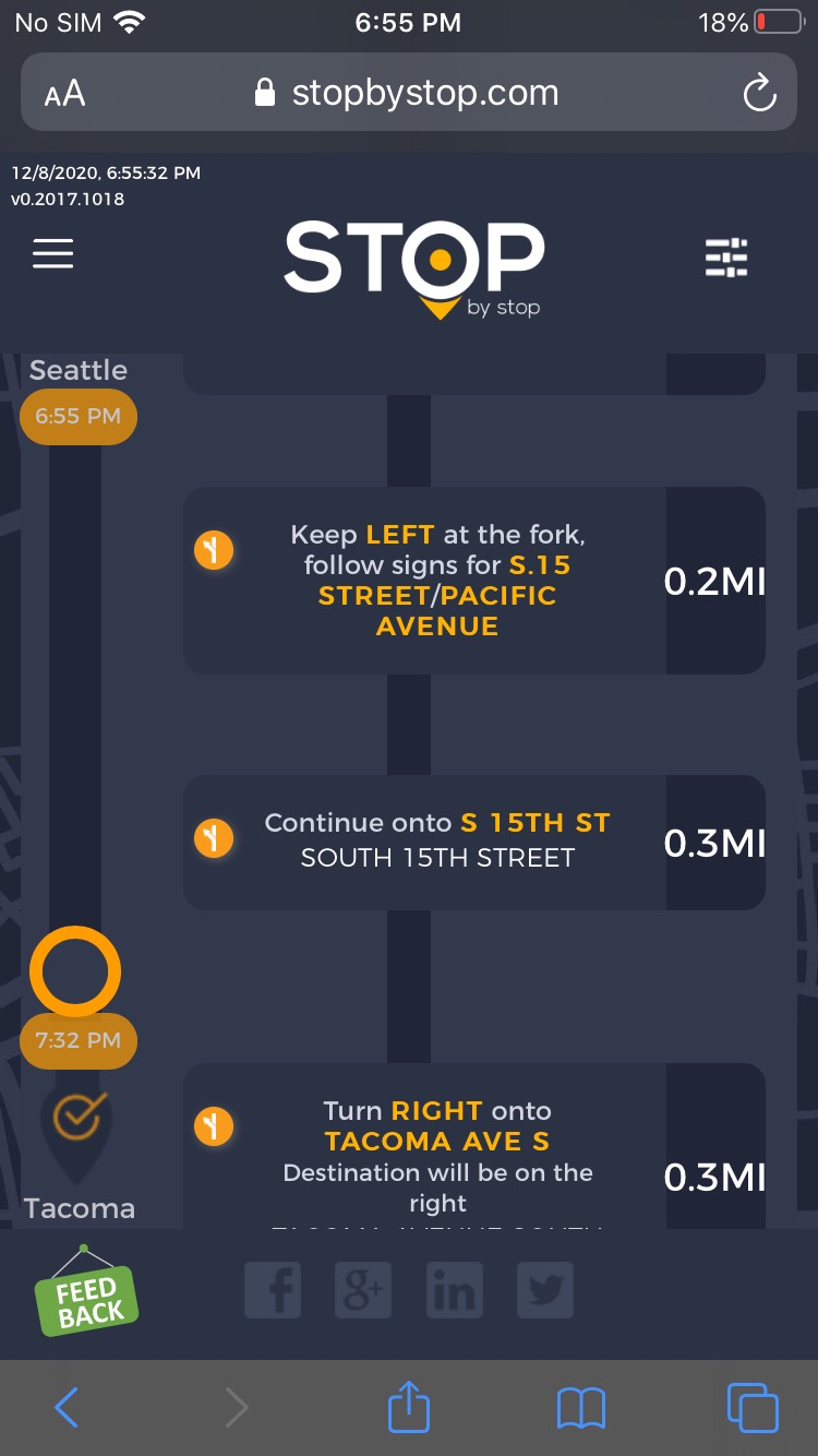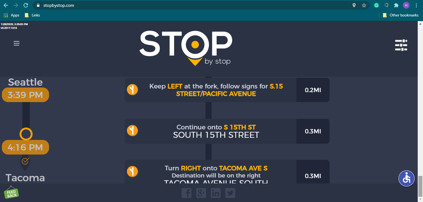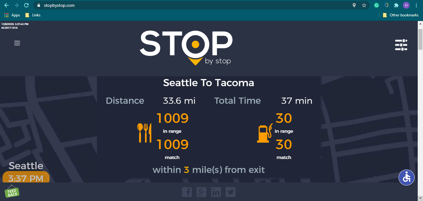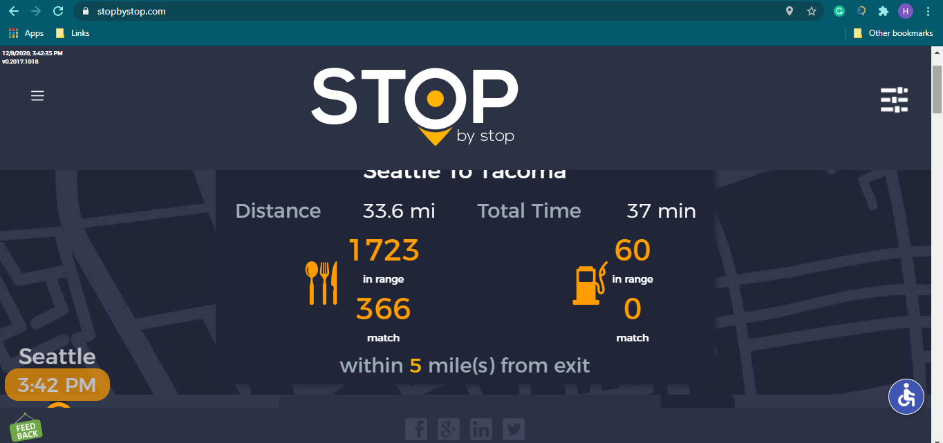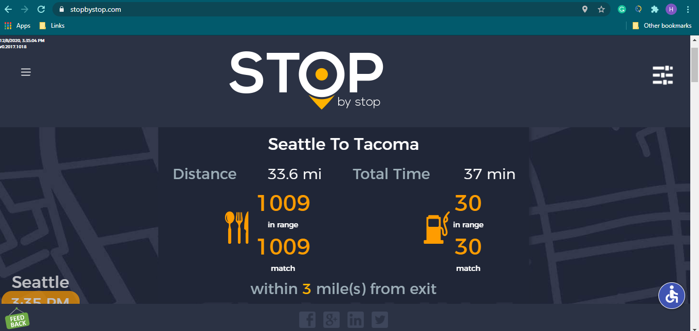 2. RoutePageRefesh. A. Navigate to test_server/ B. Type seat in the first textbox and pick Seattle from the dropdown. C. Type tac in the second textbox and pick Tacoma from the dropdown. D. Click View my trip. E. Route page should open showing exits with restaurants and gas station icons. F. Refresh the browser. Route page should open, NOT home page. Take screenshot. |