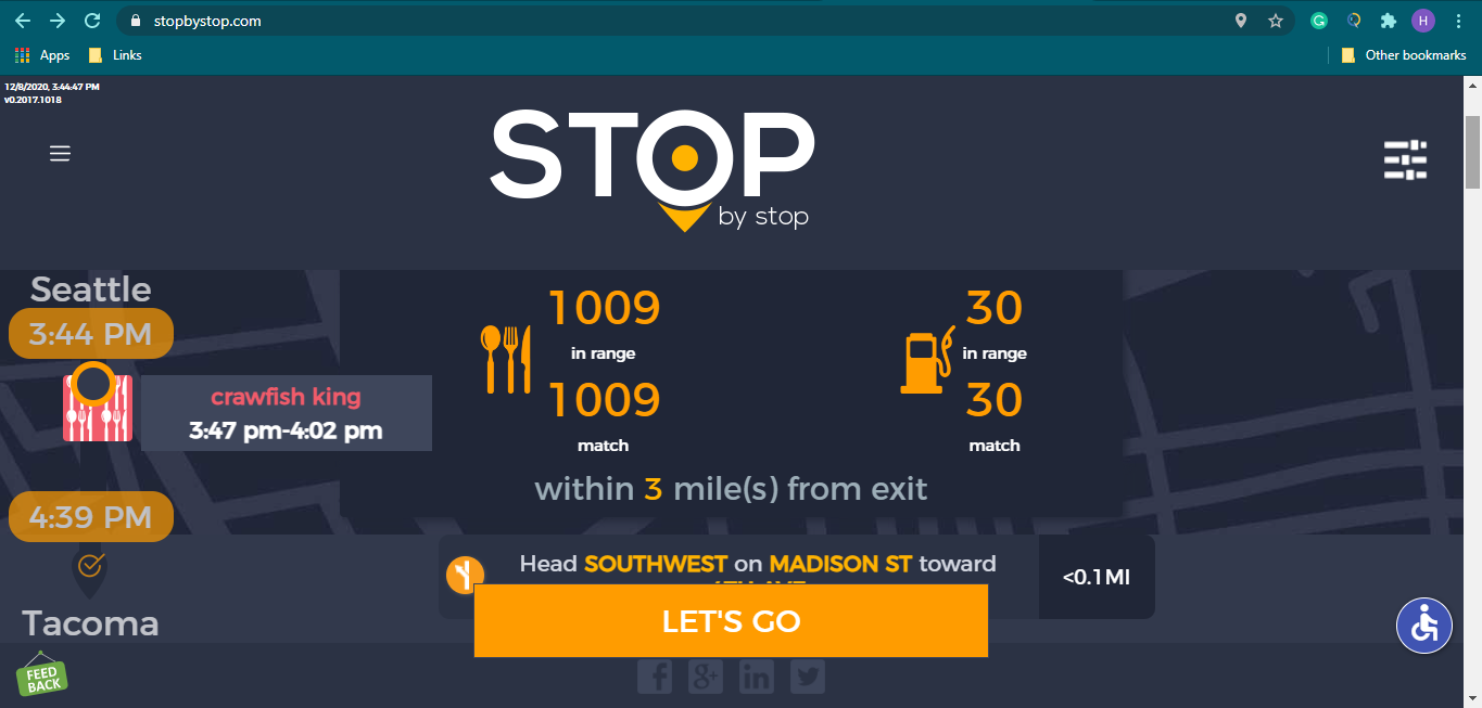 8. POISelectionGoToRoute. A. In the new browser tab open Seattle to Tacoma route. Click on first exit in the road line. Exit page should open. B. On the exit page click on the any item. POI page should open. </br/>C. On the POI page click Add to route button. POI selection popup should open. D. Click Add to route. Route page should open. E. On the sidebar there should be an icon to indicate the the place you picked. F. Click on Let's go button at the bottom of the screen. Google maps should open. Take a screenshot. |