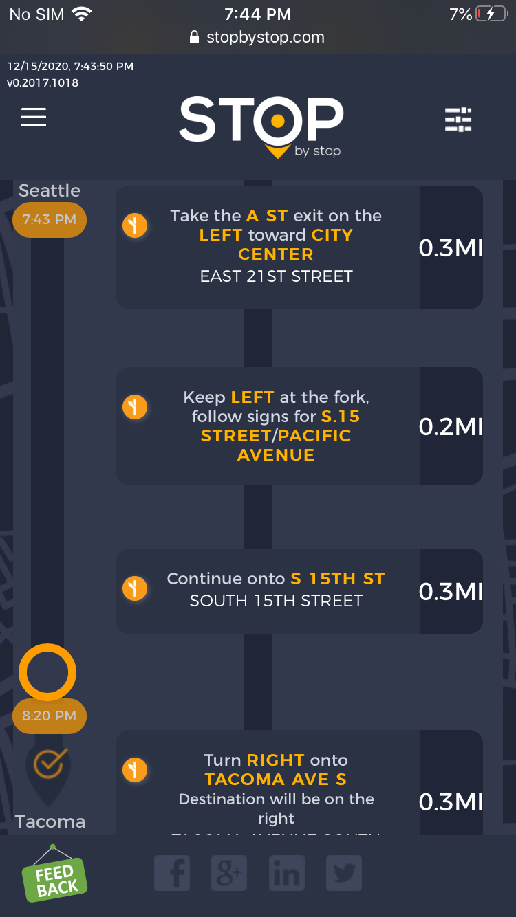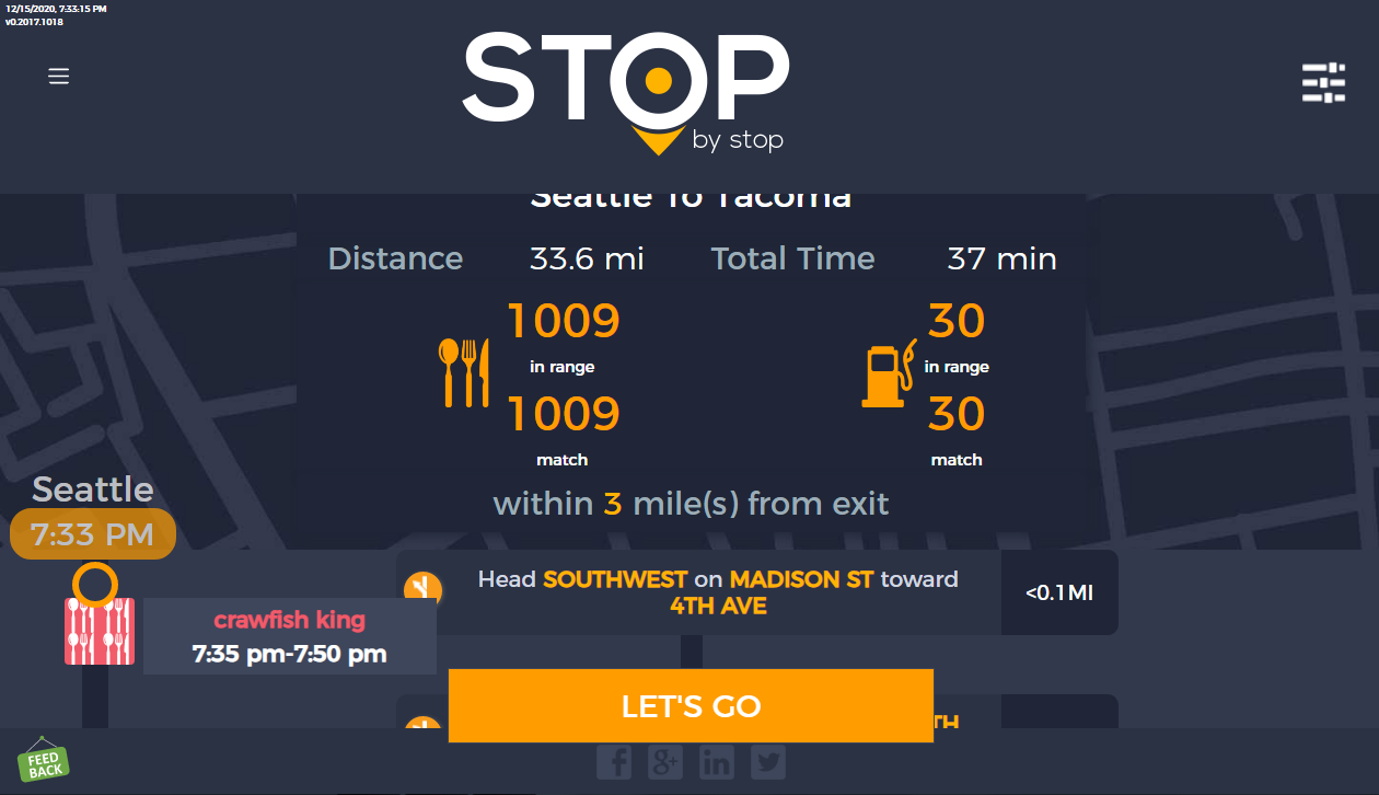 8. POISelectionGoToRoute. A. In the new browser tab open Seattle to Tacoma route. Click on first exit in the road line. Exit page should open. B. On the exit page click on the any item. POI page should open. </br/>C. On the POI page click Add to route button. POI selection popup should open. D. Click Add to route. Route page should open. E. On the sidebar there should be an icon to indicate the the place you picked. F. Click on Let's go button at the bottom of the screen. Google maps should open. Take a screenshot. |