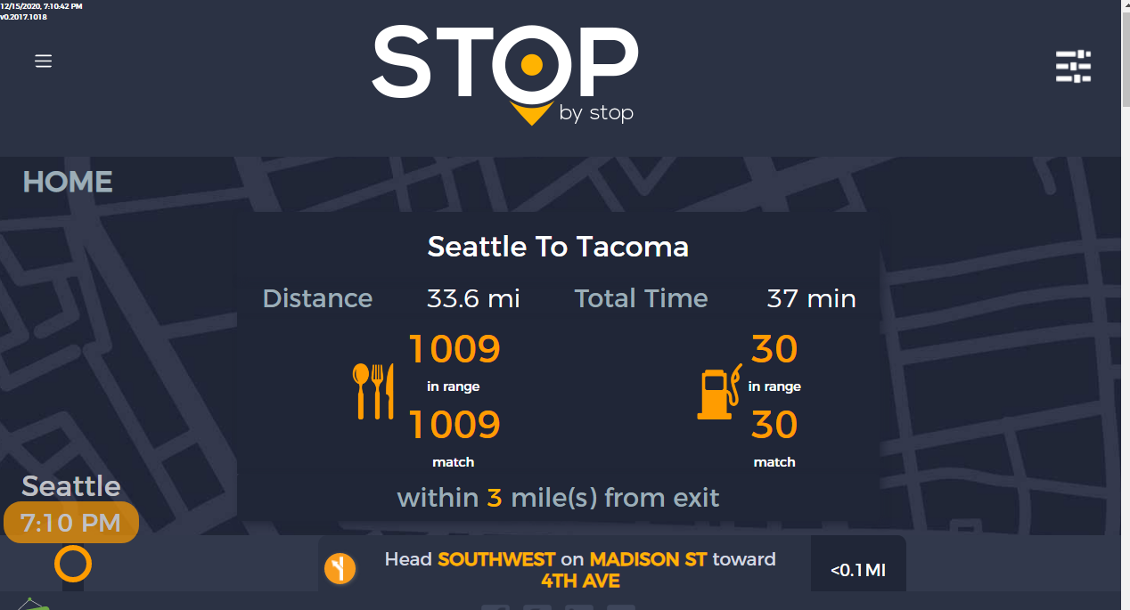 2. RoutePageRefesh. A. Navigate to test_server/ B. Type seat in the first textbox and pick Seattle from the dropdown. C. Type tac in the second textbox and pick Tacoma from the dropdown. D. Click View my trip. E. Route page should open showing exits with restaurants and gas station icons. F. Refresh the browser. Route page should open, NOT home page. Take screenshot. |