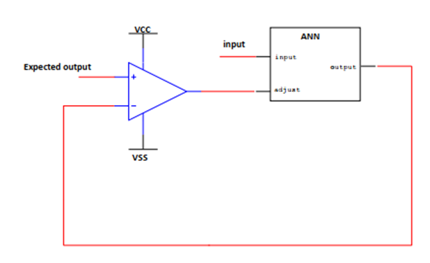 The non-inverting input of the op-amp is the expected output of the ANN and the inverting input of the op-amp is the actual output of the ANN.