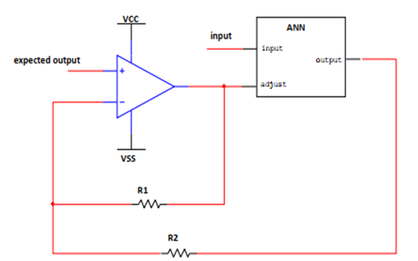 The way to adjust the weights should be designed to make the feedback end up with the equal between the actual output and the expected output of the ANN. So we can employ a voltage follower.