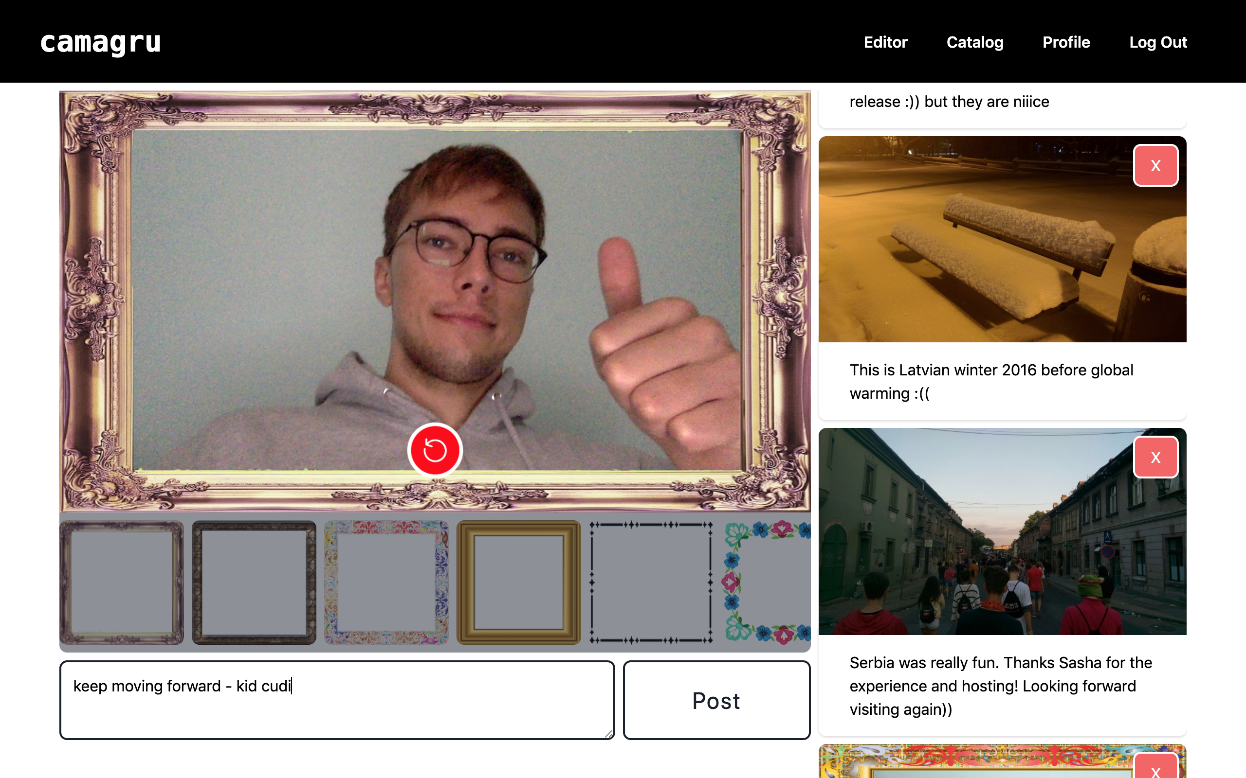 If user desires, frames can be added to the image. After description is added, new post can be submitted. Also, previous posts are available here and can be deleted too.