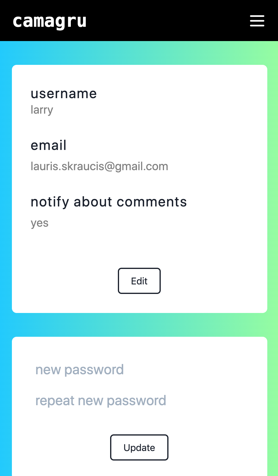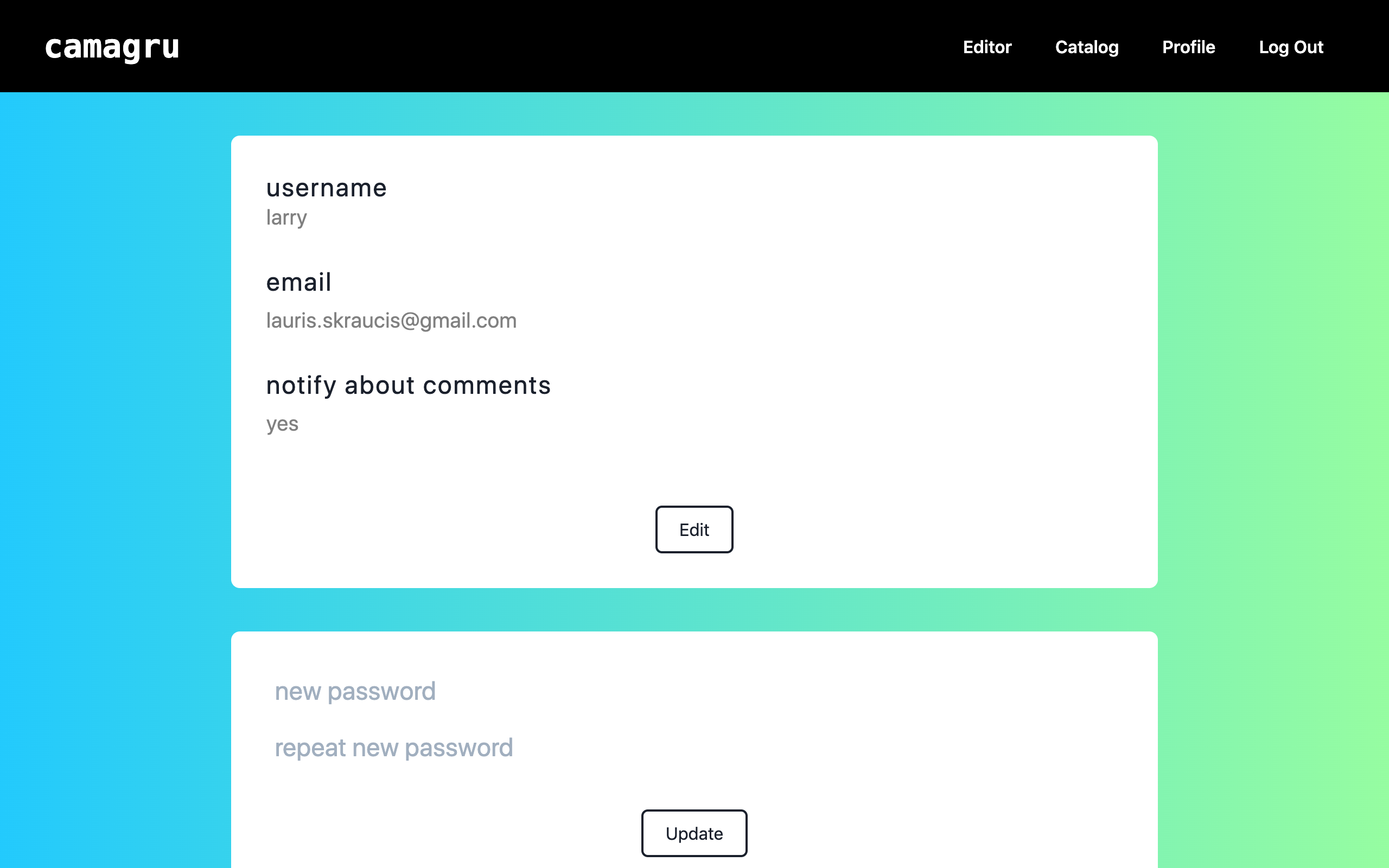 The user can also edit profile settings. Each time user's post is commented a notification via email is sent.
